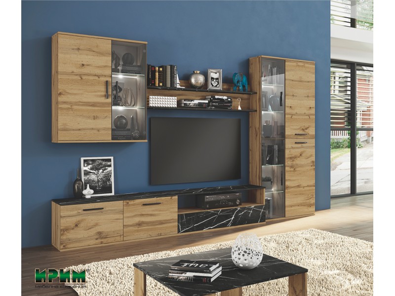 TV polica je opremljena LED osvetljenjem koje pruža belu svetlost, unoseći dodatnu dinamiku i savremeni izgled u prostor. Jedna od glavnih karakteristika ove sekcije je mekano i tiho zatvaranje vrata , što omogućava lakši i tiši rad.