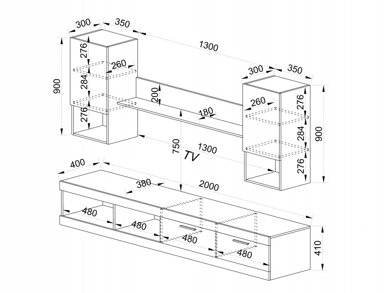 - Prostor za TV: 1300 mm (širina) x 750 mm (visina)