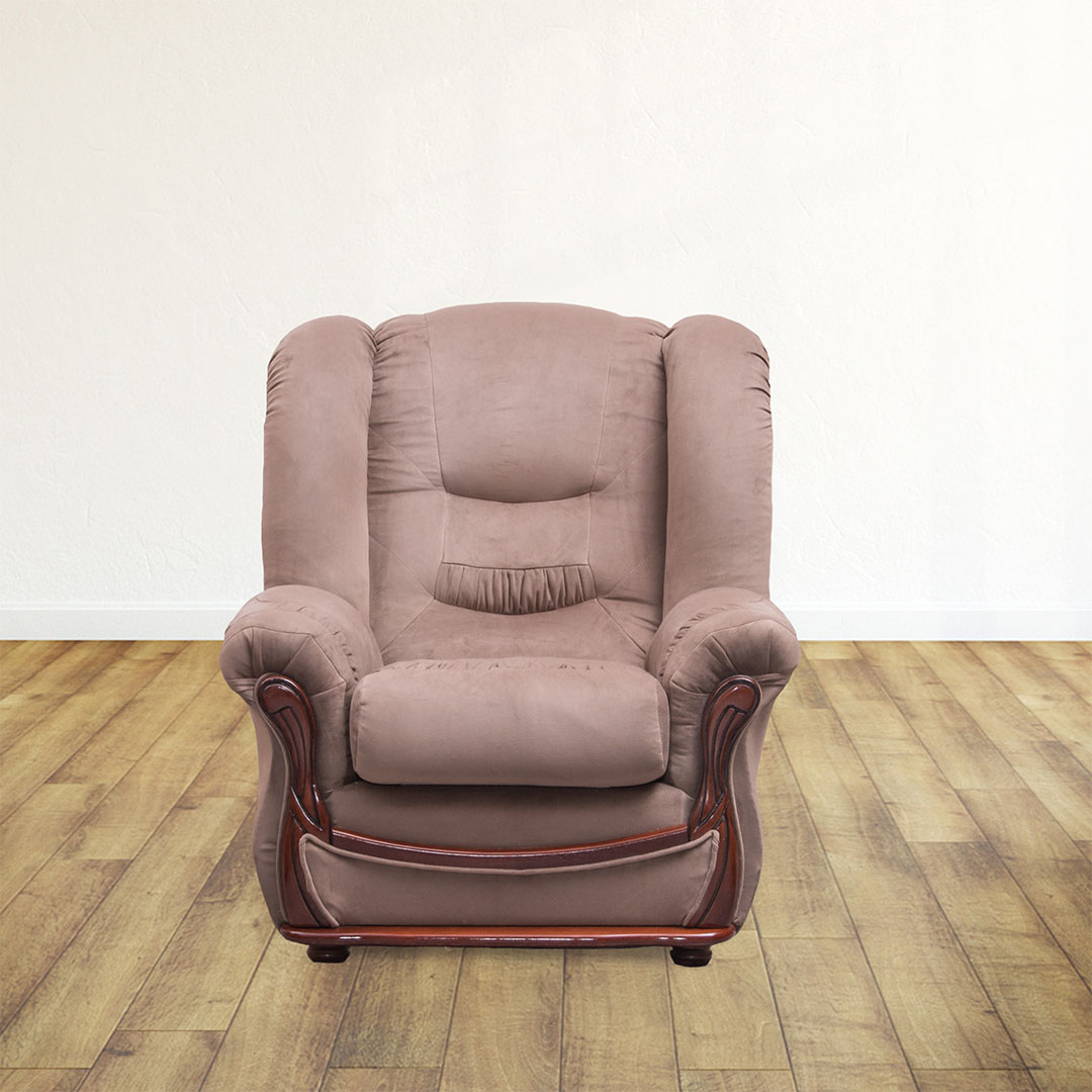 Fotelja klasičnog dizajna sa detaljima od drveta koji je čine jedinstvenom .Pogodna je kako za kancelarije tako i za dnevni boravak .Sedište je od sunđera gustine 28kg/m3 , dok je konstrukcija od bukovog drveta . Fotelja se može poručiti od kože iz ponuđene palete boja .