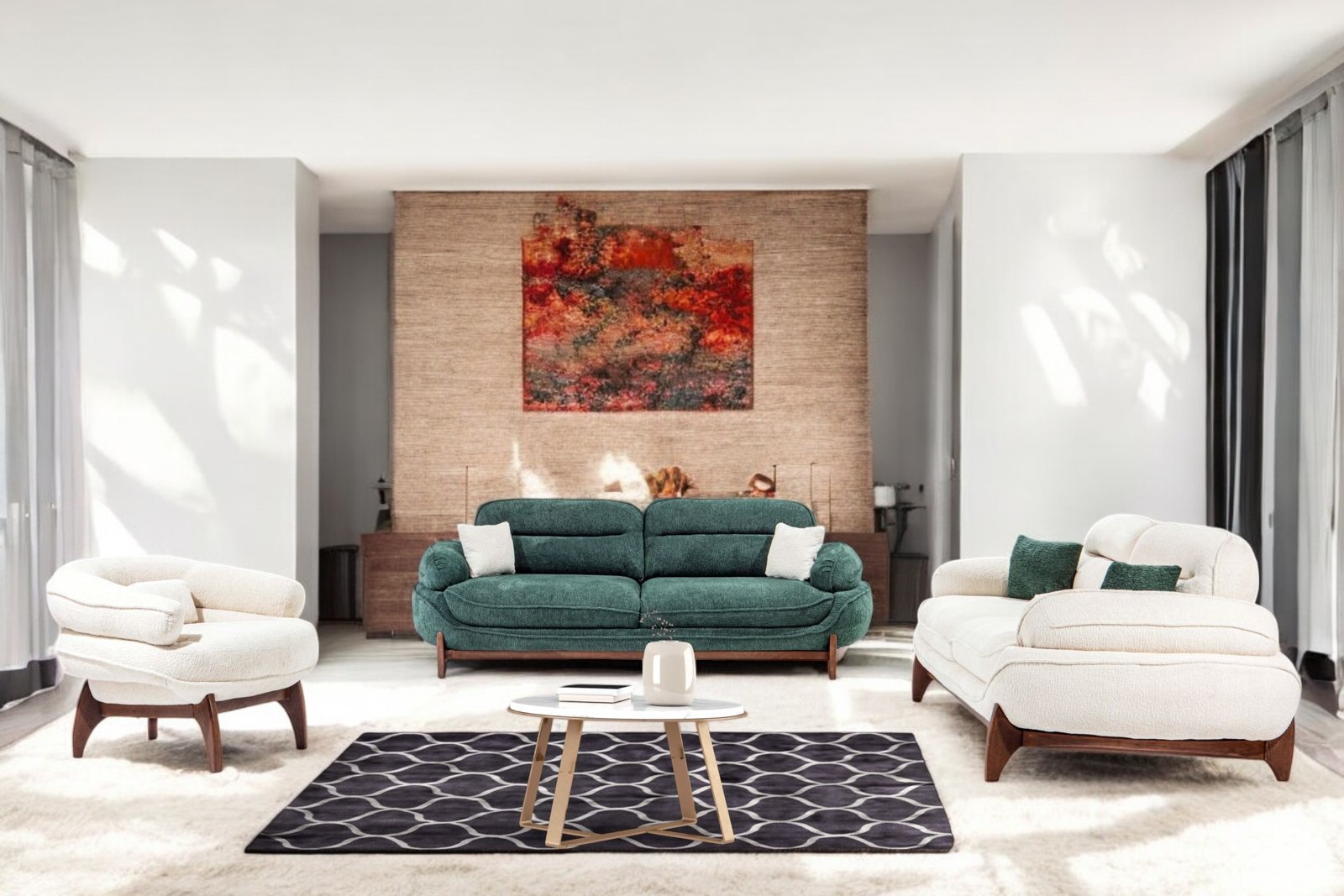 Garnitura Flora odiše toplinom i modernim dizajnom koji unosi harmoniju u svaki prostor. Sastoji se od dva troseda i fotelje, savršeno uklopljenih u jedinstven stilski sklad.