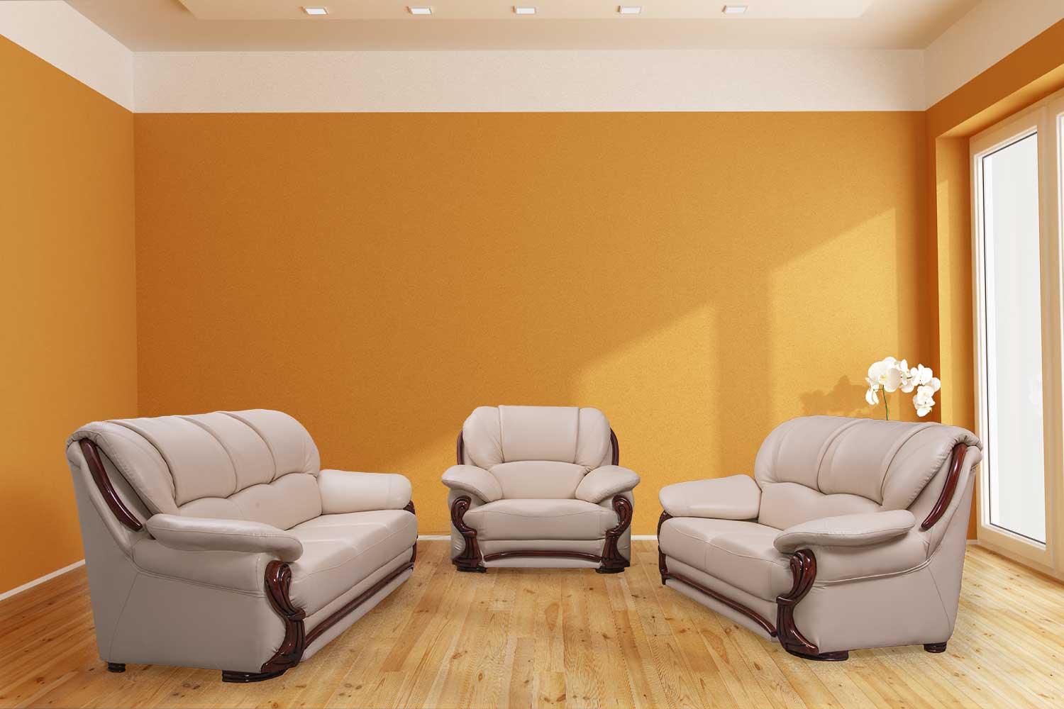 Garnitura Lux je prpeoznatljiva po svojim drvenim aplikacijama koje su kod nje veoma specifično obrađene i mogu biti u različitim bojama . Sedišta su od sunđera gustine 28kg/m3 dok je konstrukcija od bukovog drveta .