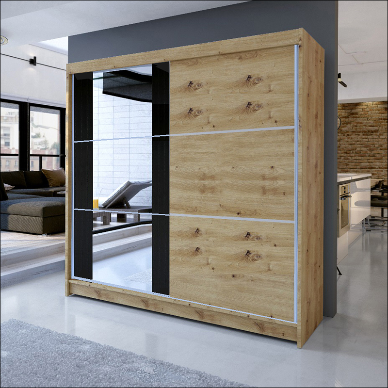 Klizni plakar Arti 4 predstavlja upečatljiv i moderan komad nameštaja namenjen savremenim enterijerima. Atraktivna kombinacija toplog dekora Hrast Artisan i elegantnog crnog fronta sa velikim ogledalom daje prostoru luksuzan i sofisticiran izgled.