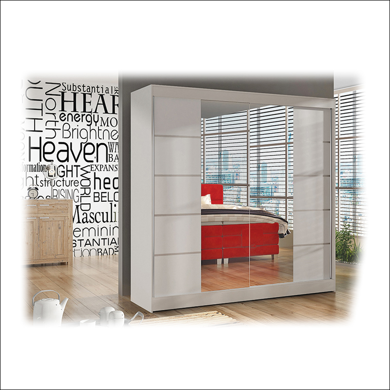 Zahvaljujući kliznim vratima, plakar omogućava optimalno korišćenje prostora, što ga čini idealnim izborom za spavaće sobe, garderobere i stanove sa ograničenim prostorom. Velika površina ogledala je praktična za svakodnevnu upotrebu i vizuelno povećava prostor, dok istovremeno doprinosi modernom izgledu plakara.