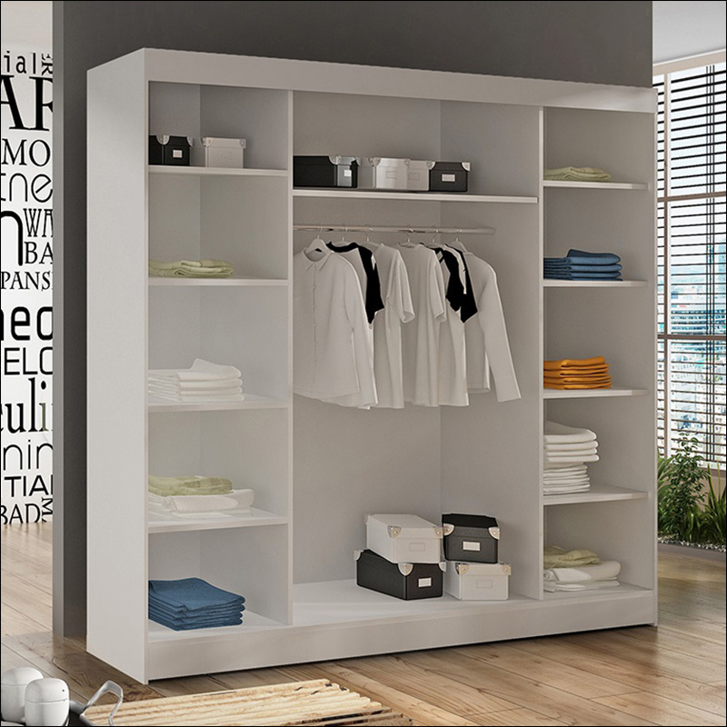 Zahvaljujući kliznim vratima, plakar omogućava optimalno korišćenje prostora, što ga čini idealnim izborom za spavaće sobe, garderobere i stanove sa ograničenim prostorom. Velika površina ogledala je praktična za svakodnevnu upotrebu i vizuelno povećava prostor, dok istovremeno doprinosi modernom izgledu plakara.