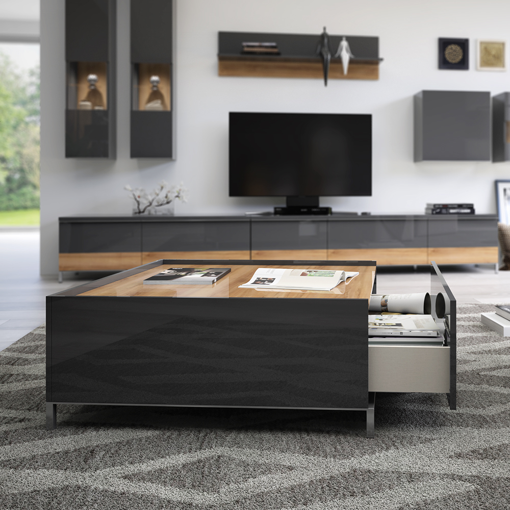 Funkcionalan i moderan klub sto za dnevnu sobu iz kolekcije ONYX, sa dve fioke.