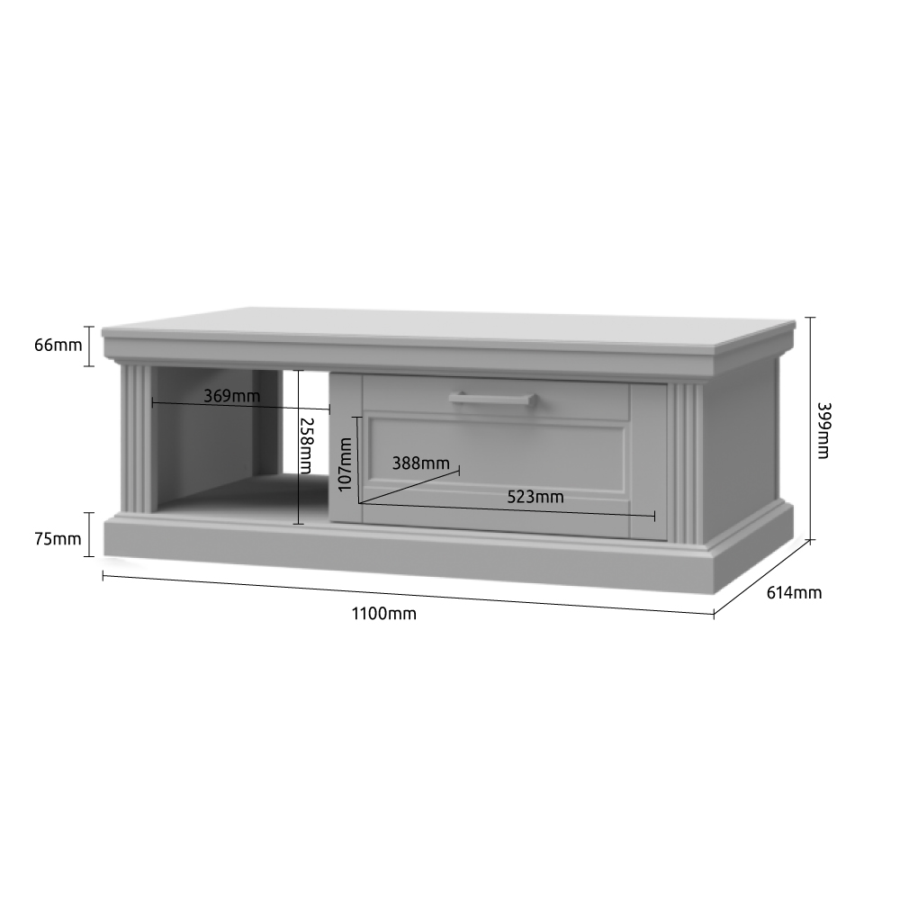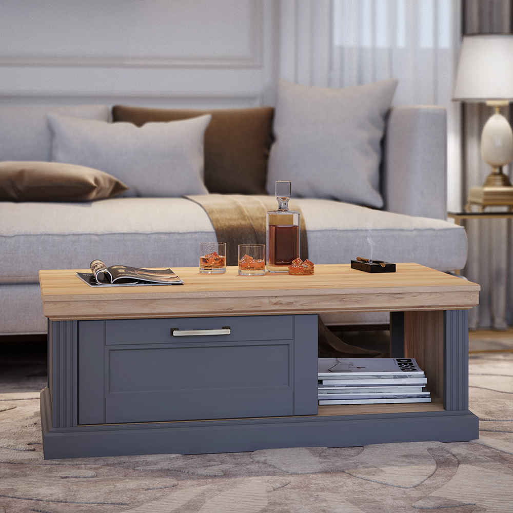 Klub sto za dnevni boravak iz kolekcije Tara sa jednom fiokom i otvorenom policom.