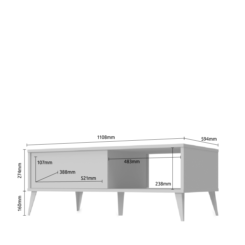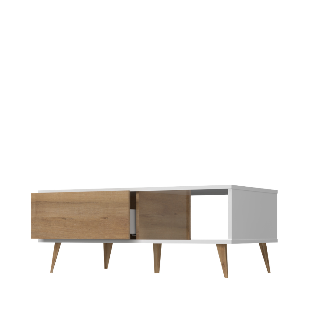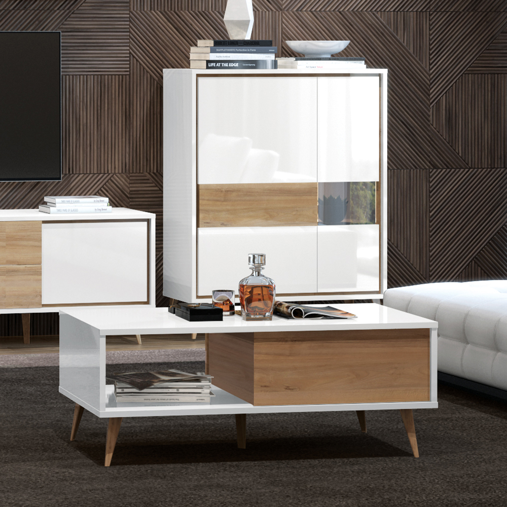 Klub sto za dnevnu sobu, iz kolekcije VIDA, u kristalno beloj boji sa frontovima fioke u drvo-dekoru Pacifik orah. Ovaj komad nameštaja uneće duh 60-ih godina u vašu dnevnu sobu.