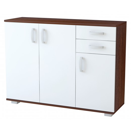 Praktična i elegantna komoda sa 3 vrata i 2 fioke, idealna za dnevni boravak, spavaću sobu, hodnik ili kancelarijski prostor. Kombinacija belih fronti i tamnog dekora daje moderan i uredan izgled koji se lako uklapa u različite stilove enterijera.