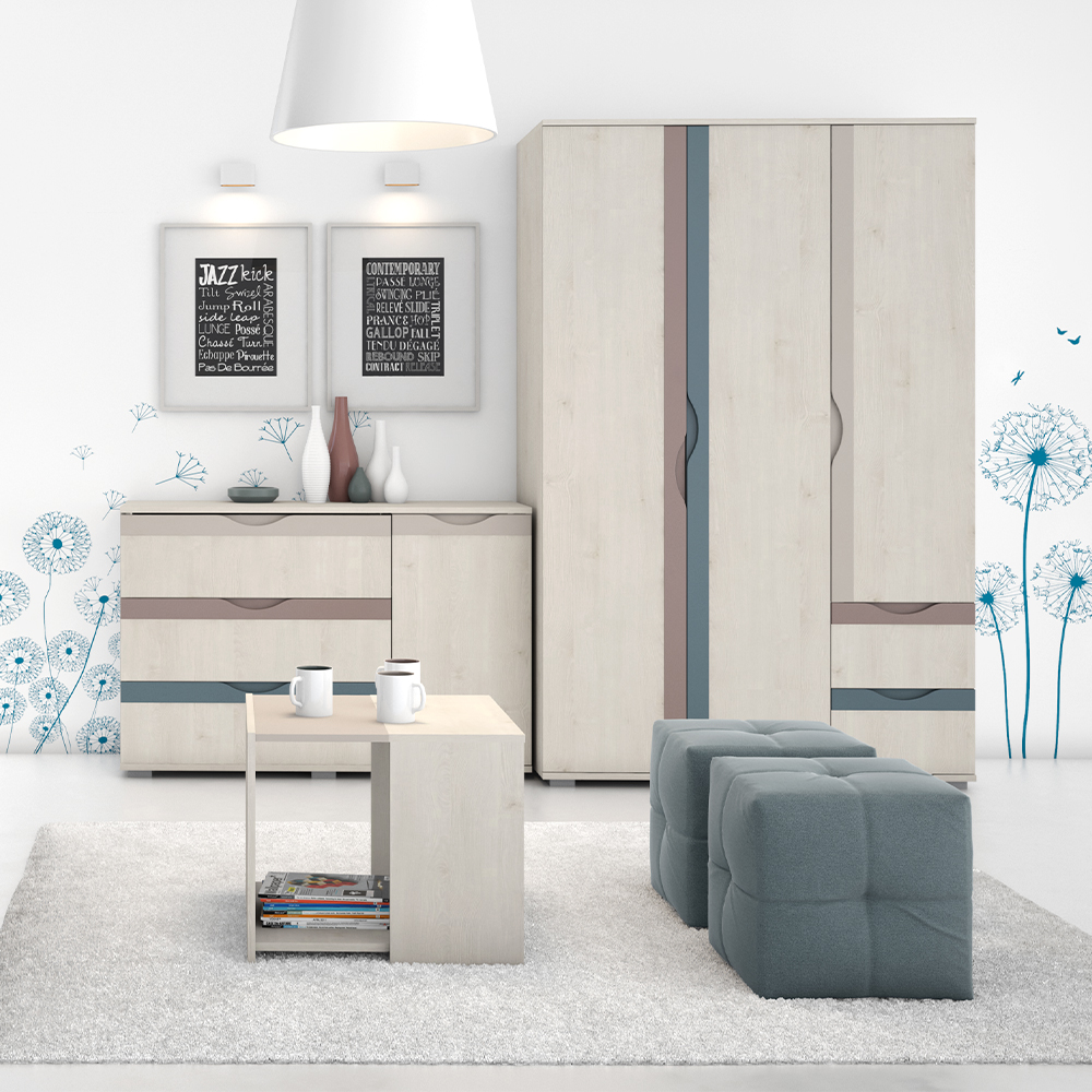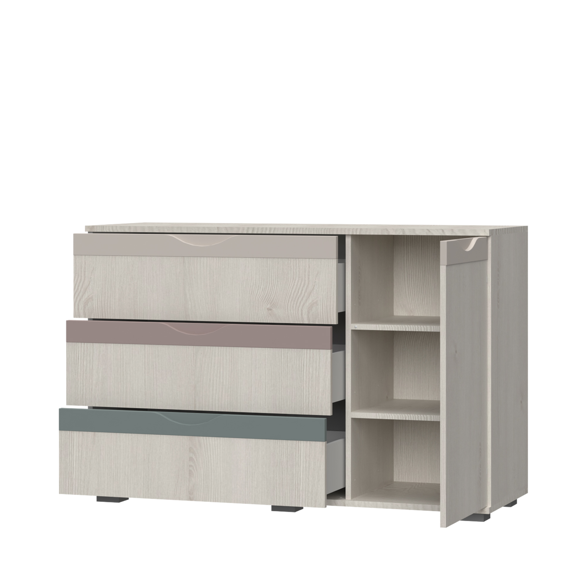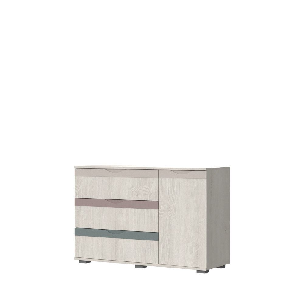 Komoda za dečiju sobu, iz kolekcije JOY, sa jednim krilom i tri fioke koje imaju dekorativne ručice od medijapana veselih boja