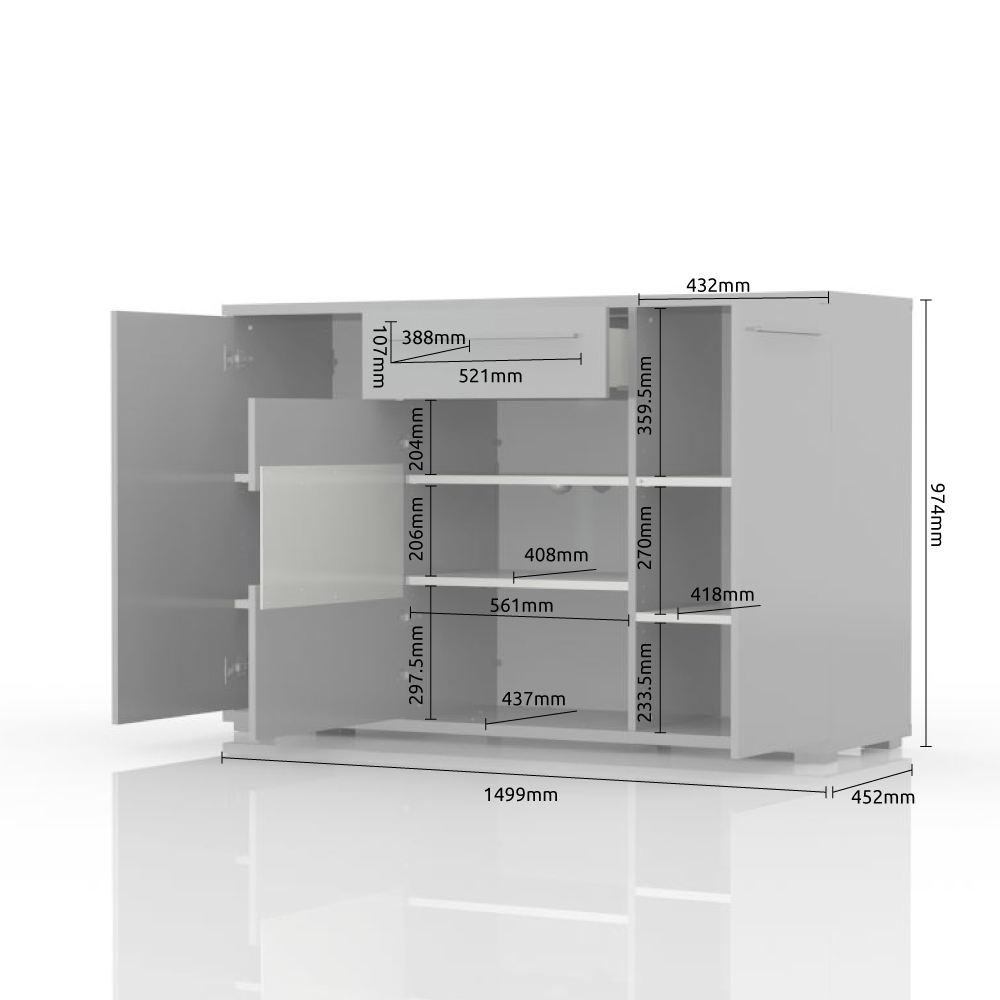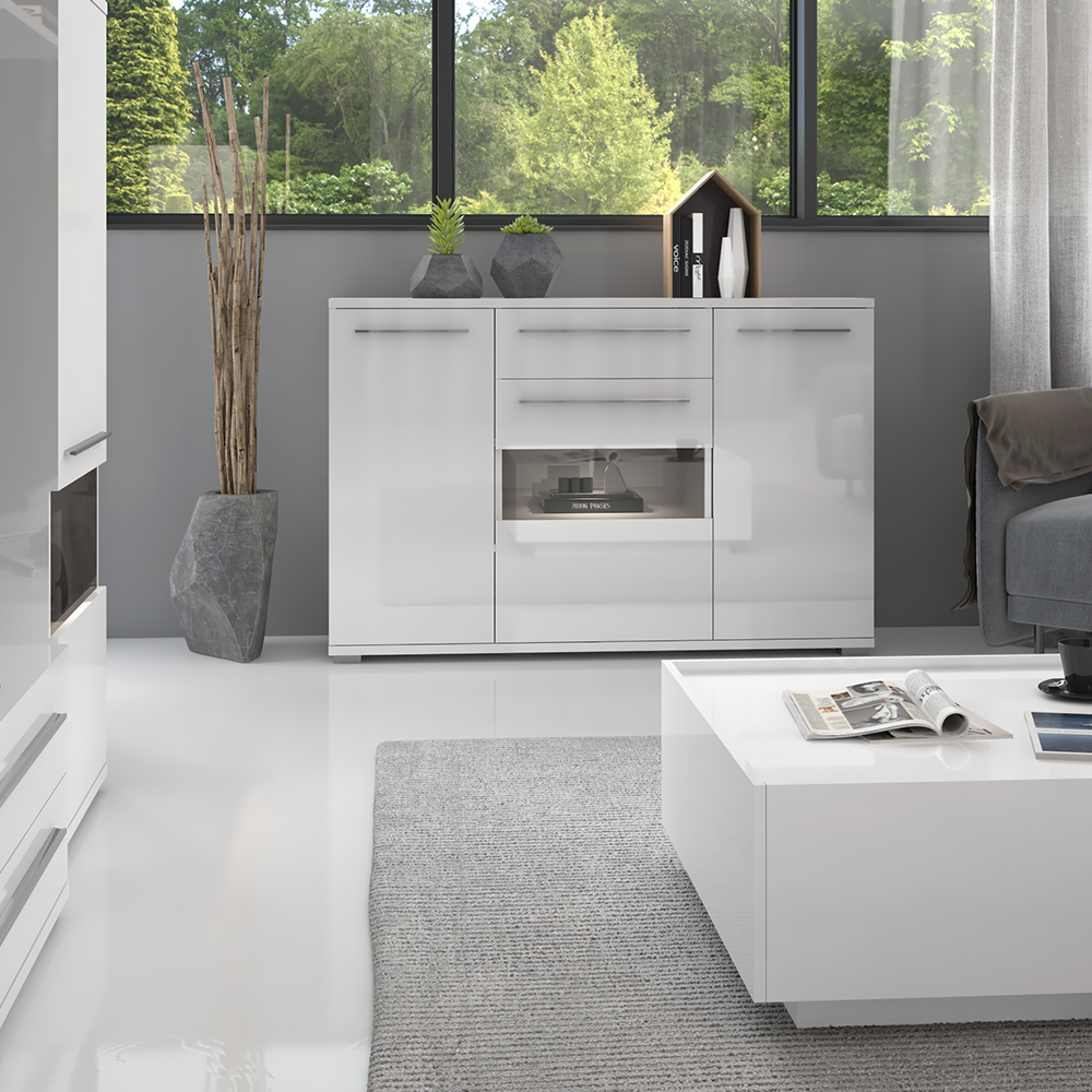 Funkcionalna komoda iz kolekcije nameštaja PIANO sa dva puna, jednim staklenim krilom I jednom fiokom, dizajnirane geometrijske forme.
