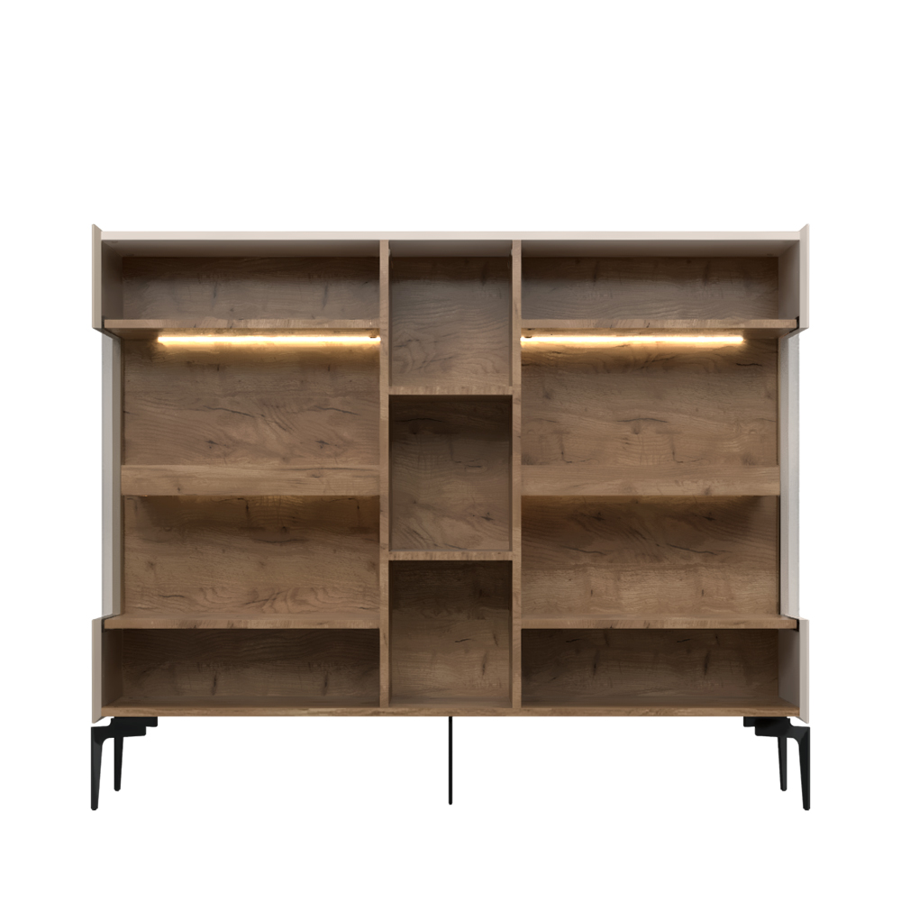 - masivne police unutar elemenata sa skrivenom LED rasvetom i punim leđima u drvo-dekoru Tobacco hrast kao i parsol staklo u braon boji, daju ovoj komodi jedinstveni izgled