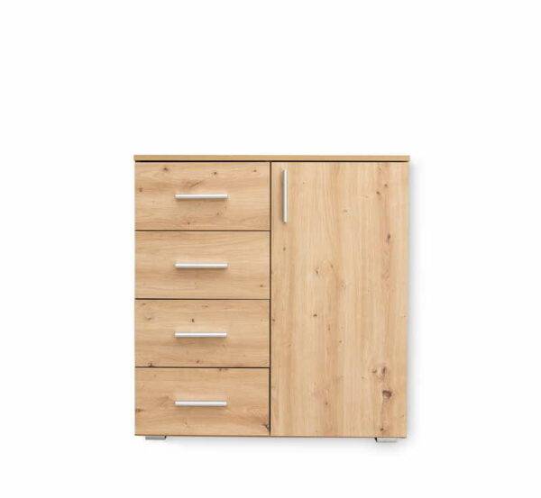 Komoda Merlin 4F1K je pravi funkcionalni odgovor na sve zahteve u enterijeru za dodatnim prostorom za odlaganje najrazličitijih stvari. Ovaj model komode deo je istoimene kolekcije Merlin komoda, namenjene kvalitetnom i ekonomičnom uređenju životnog prostora. Komode Merlin izrađene su od oplemenjenog univera debljine 16mm. Komode Merlin su veoma prostrane, četiri funkcionalne fioke i skladišni prostor podeljen sa 2 poprečne police. Zahvaljujući modernom dizajnu komode Merlin 4F1K mogu se koristiti u vašem domu kancelariji ili drugim objektima.
