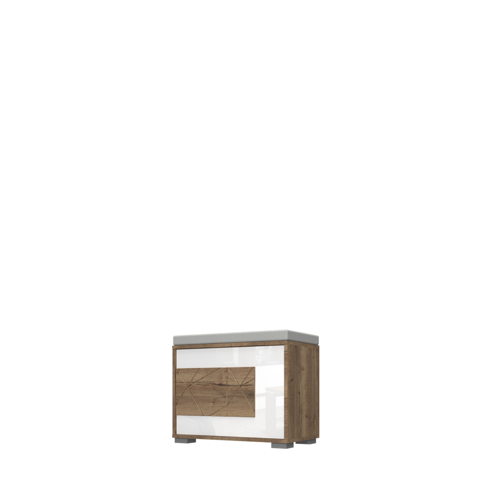 Komoda za predsoblje iz kolekcije STELA sa jednim krilom i tapaciranim jastukom za sedenje debljine 5 cm.