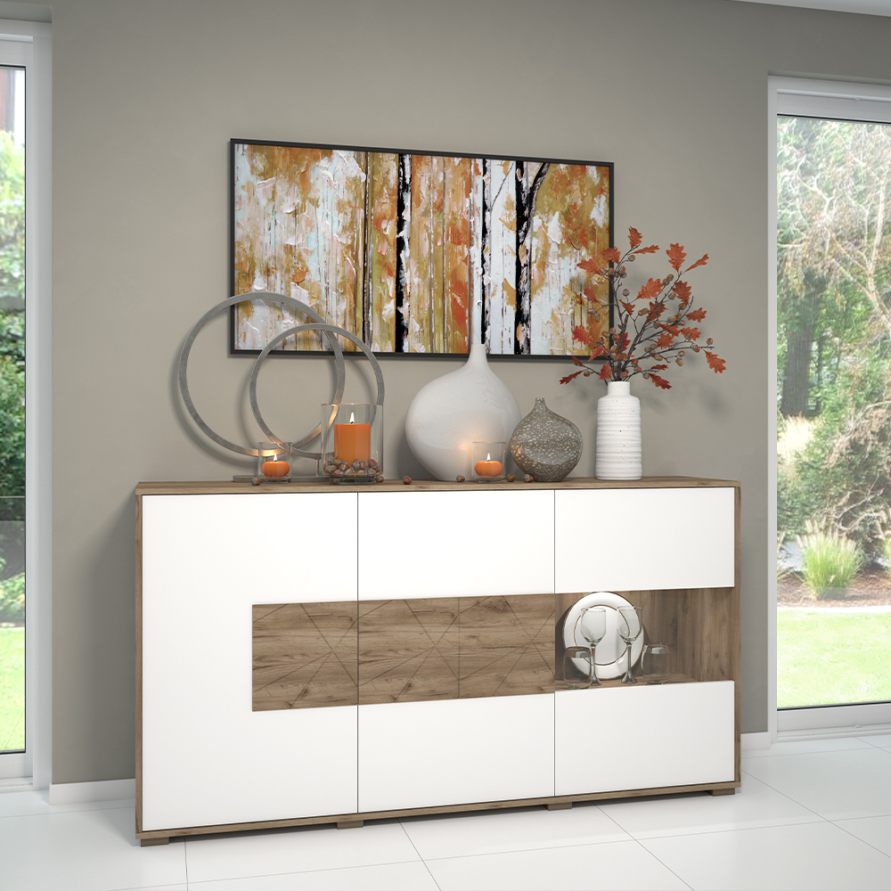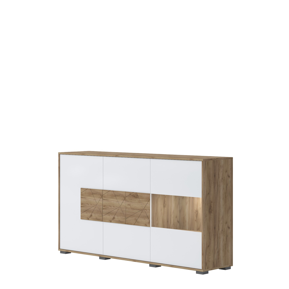 Komoda za dnevnu sobu, iz kolekcije STELA, sa dva puna krila i jednim krilom sa staklom. Ovaj element nameštaja je savremenog dizajna, te će se savršeno uklopiti u moderne dnevne sobe.