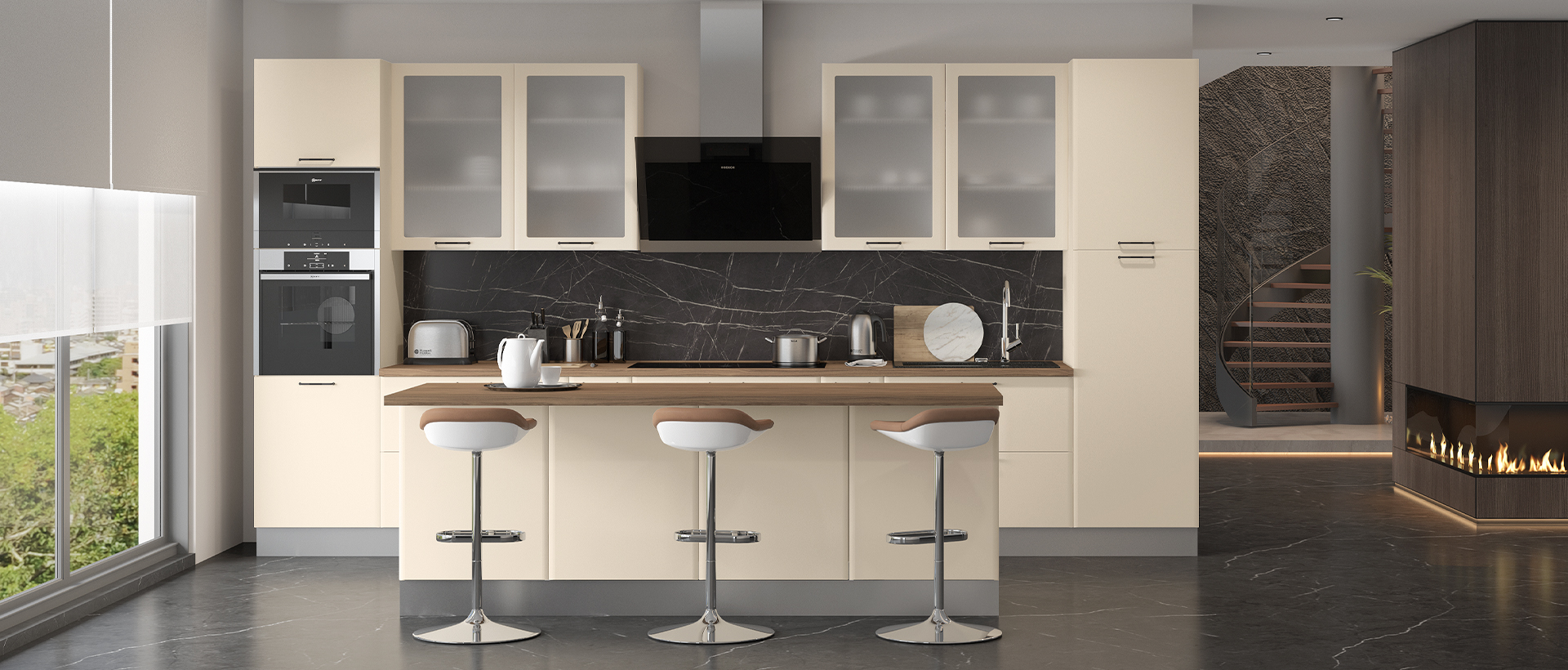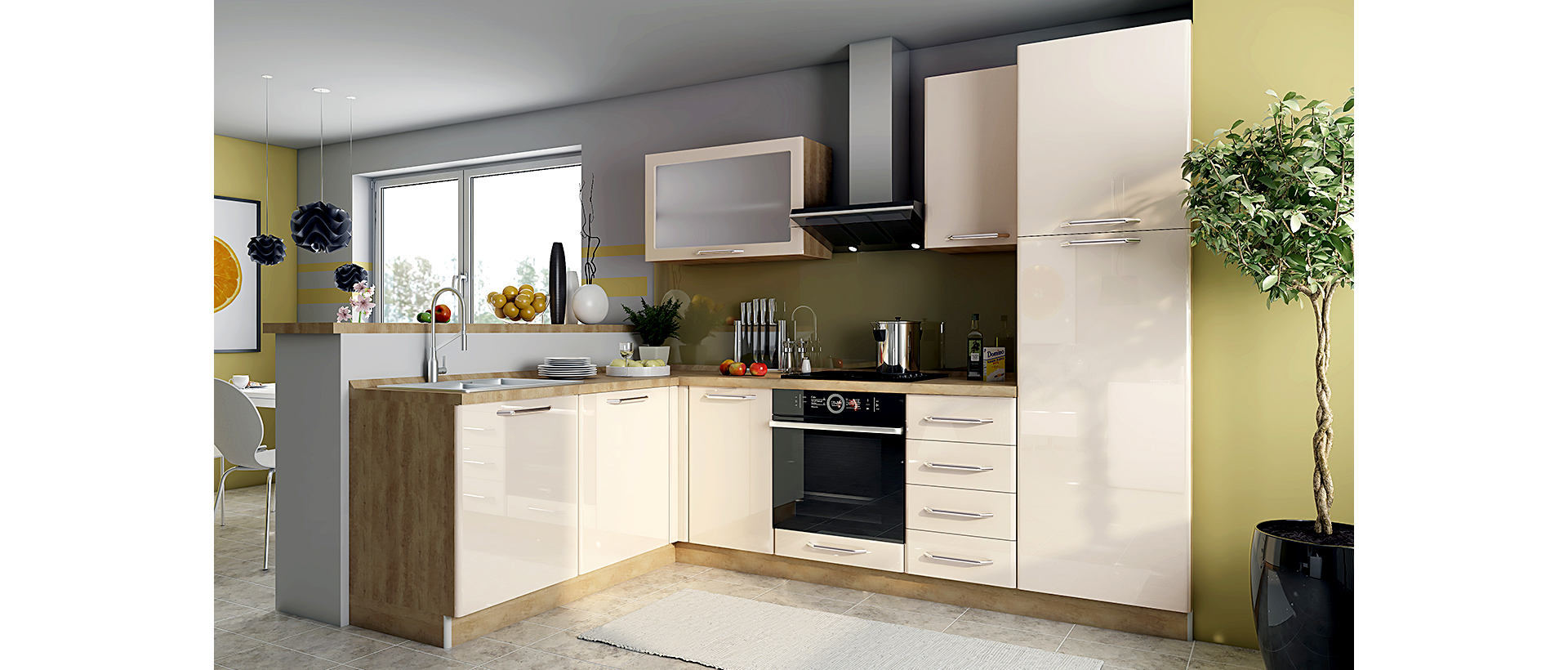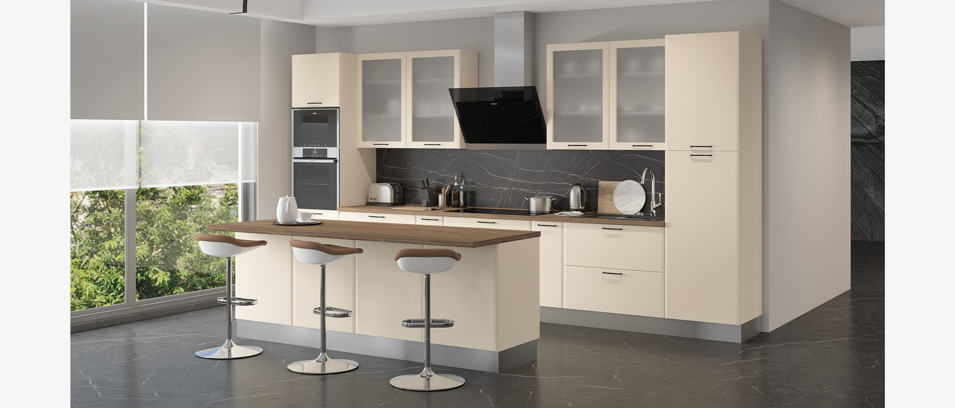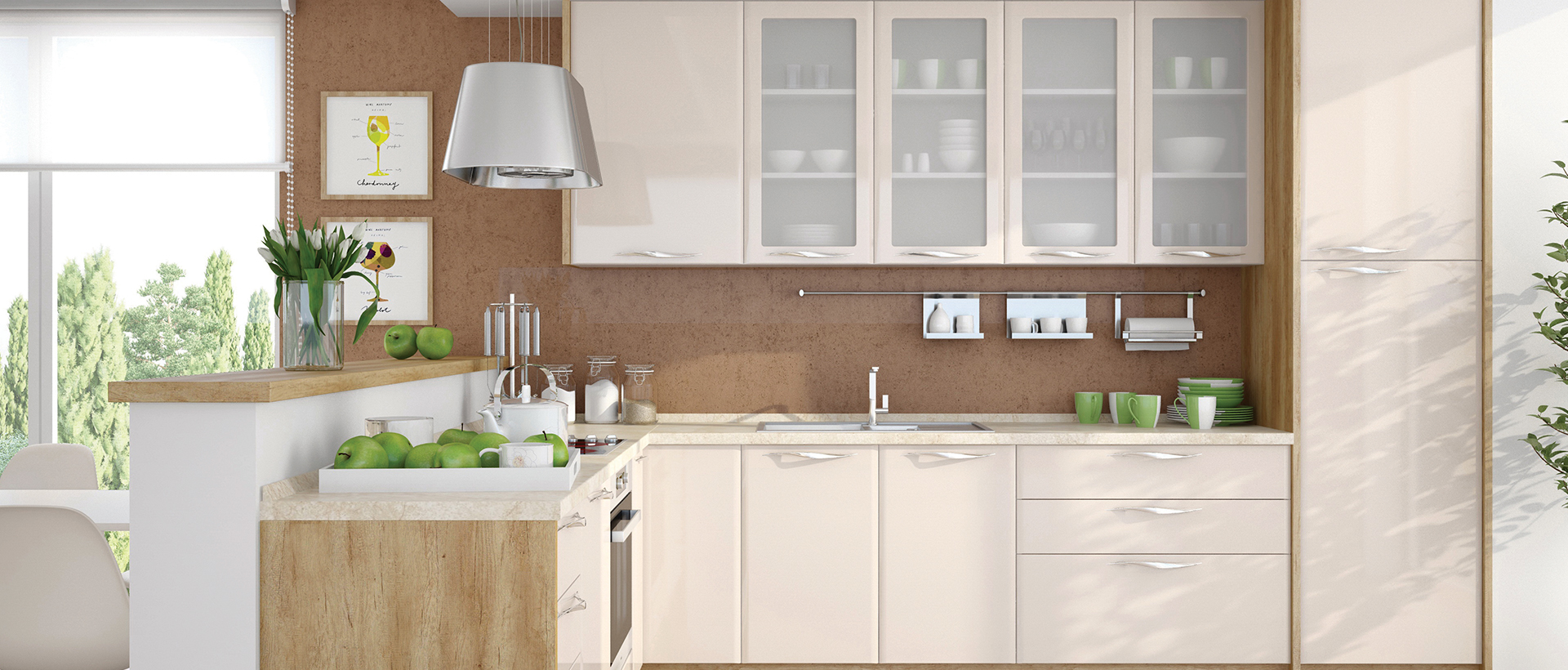 Kuhinja Modern sa frontovima od medijapana i visokom sjaju. Dostupna u bojama bež, bela i kašmir.