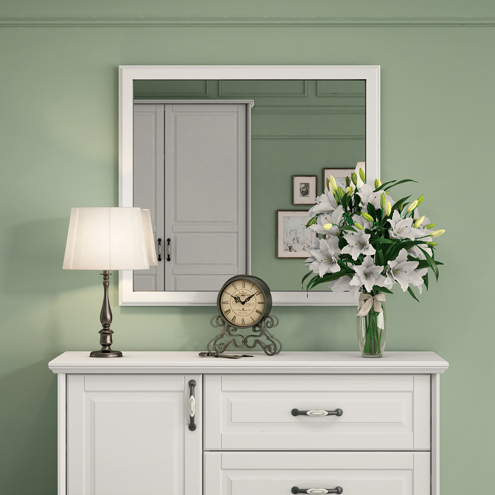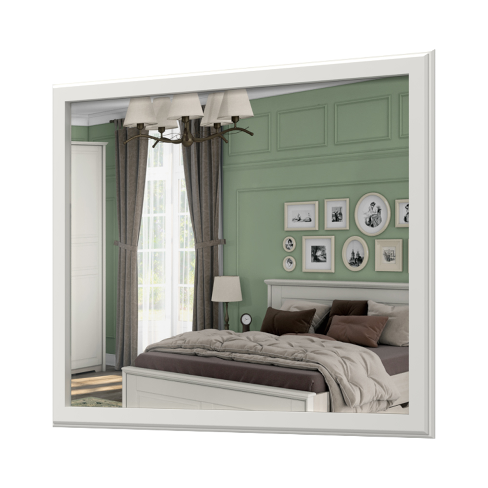 • ogledalo na podlozi od univera u belom drvo-dekoru, sa ramom od dekorativnih profilisanih lajsni od medijapana debljine 25 mm u boji slonove kosti