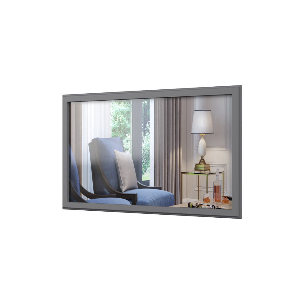 Ogledalo iz kolekcije TARA, sa ramom od stilski profilisanih lajsni izrađenih od medijapana kompletno lakiranog UV lakom sa soft mat efektom u grafit ili beloj boji i masivnom pokrivnom pločom u dekoru Pacifik orah .