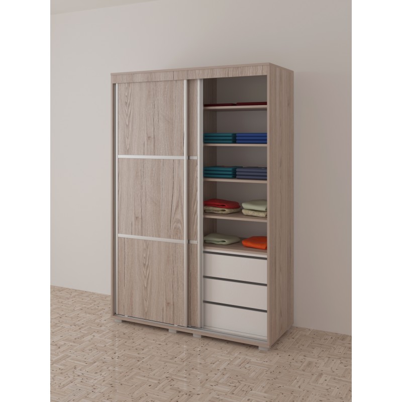 Ormar je izrađen u elegantnom drvenom dezenu, sa modernim vertikalnim lajsnama na frontu koje dodatno naglašavaju njegov savremen stil. Unutrašnjost je pametno organizovana i sadrži više polica, prostor za uredno slaganje garderobe, kao i fioke u donjem delu koje su praktične za odlaganje sitnijih stvari poput veša.