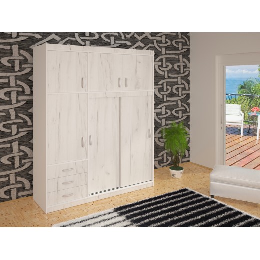 Ormar u elegantnoj kombinaciji bele boje sa modernim detaljima, savršen je za organizaciju vašeg prostora. Ovaj ormar nudi tri klizna vrata, uz prostrane fioke i police, pružajući optimalno skladištenje za odeću i lične stvari. Sa savremenim dizajnom i praktičnom funkcionalnošću, lako se uklapa.