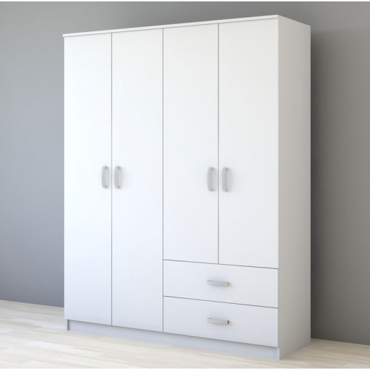 Ormar poseduje četvoro krilnih vrata i dve velike fioke u donjem delu, savršene za odlaganje veša, aksesoara i sitnijih predmeta. Opremljen je jednostavnim ručkama i podignut na kratkim nožicama, što olakšava čišćenje i doprinosi vizuelnoj lakoći konstrukcije.