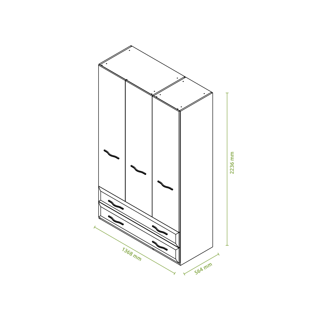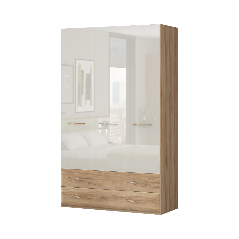 Funkcionalni plakar za spavaću sobu‚ iz kolekcije GALA jake geometrijske forme. Ovaj element nameštaja sadrži tri krila i dve fioke.