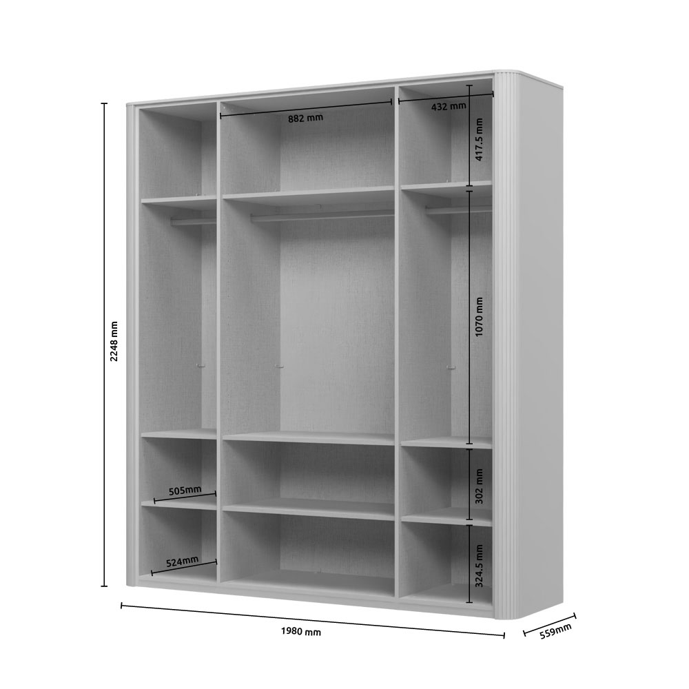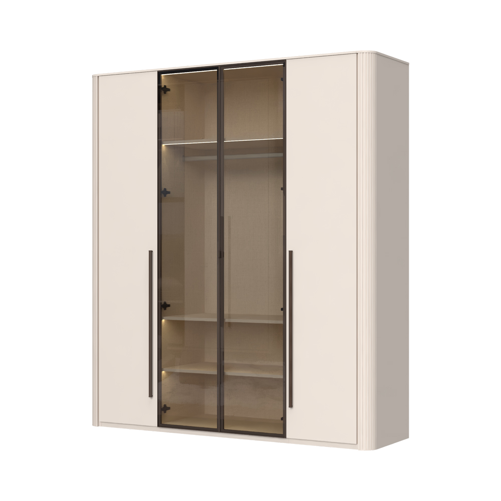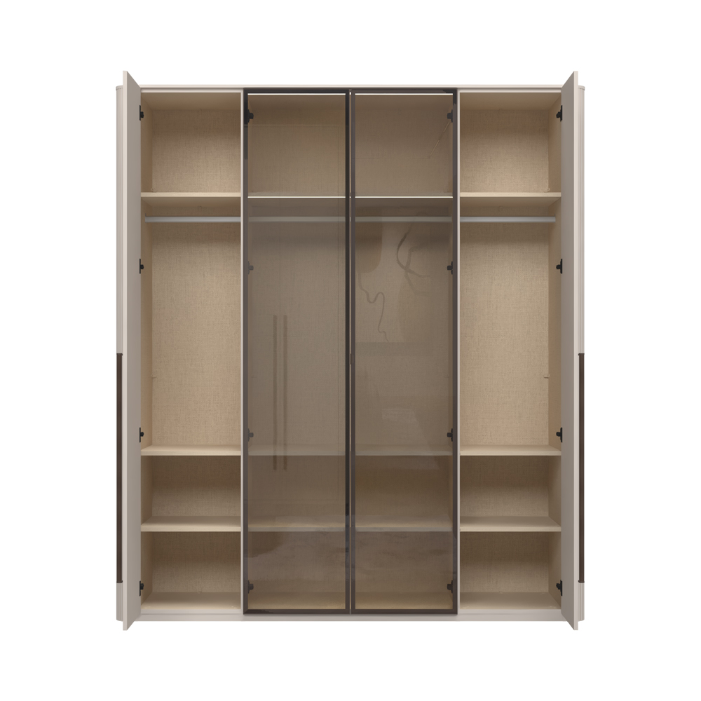 Funkcionalni plakar sa 2 krila lakirana UV soft mat lakom u dekoru Kašmir i 2 staklena fronta sa aluminijumskim ramom u dekoru Midnight Copper.