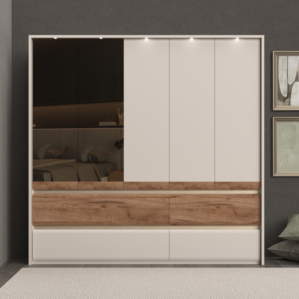 Plakar za spavaću sobu iz prestižne kolekcije INVICTUS sa pet krila, od kojih su dva sa ogledalima i četiri fioke skladne i meke forme frontova.
