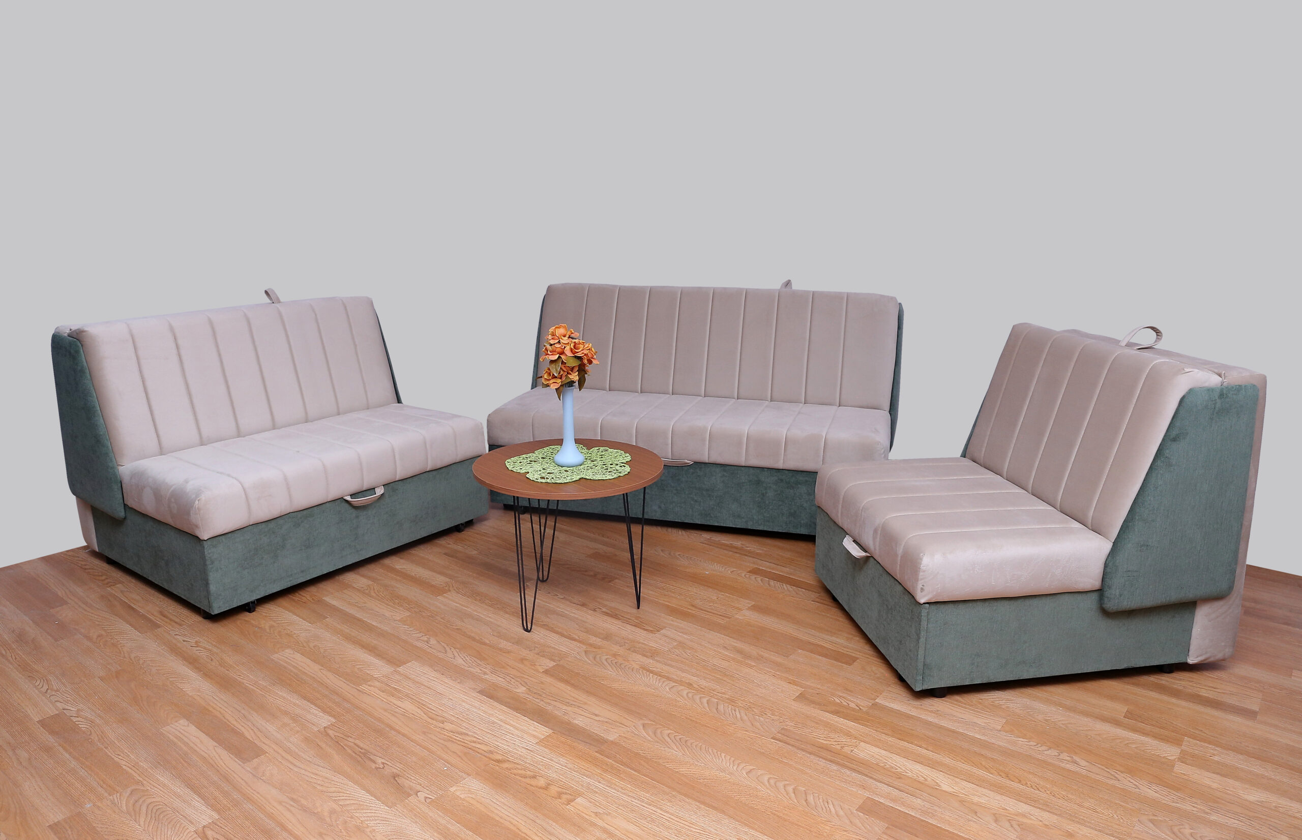 Sofa set „MOJCA” je idealan izbor za udobnost i funkcionalnost u vašem domu. Sastoji se od troseda (165x100x92 cm), dvoseda (125x100x92 cm) i fotelje (85x100x92 cm), koji pružaju savršen komfor za opuštanje. Ramovska konstrukcija je izrađena od drva topole, jove ili bukve, što garantuje dugotrajnost. Preko ramova je postavljen lesonit debljine 3,2 mm, dok je sunđer gustine 25 kg/m³ obložen štofom u kombinaciji sa eko kožom za dodatnu udobnost. Delovi kutije i stranica izrađeni su od sirove iverice debljine 16 mm, a za lakše podizanje i spuštanje koriste se šarniri i točkići.