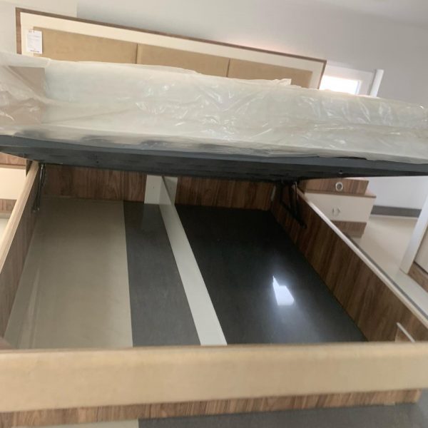 Francuski ležaj izrađen je od punog drveta (bukva), sa kutijom za odlaganje i mehanizmom podizanja s čeličnim amortizerima. Tapaciranje je od najkvalitetnijeg mebl štofa WISCHPER, uzglavlje sa duplim štepom i dekorom u boji hrasta. ( Dušek nije uključen )