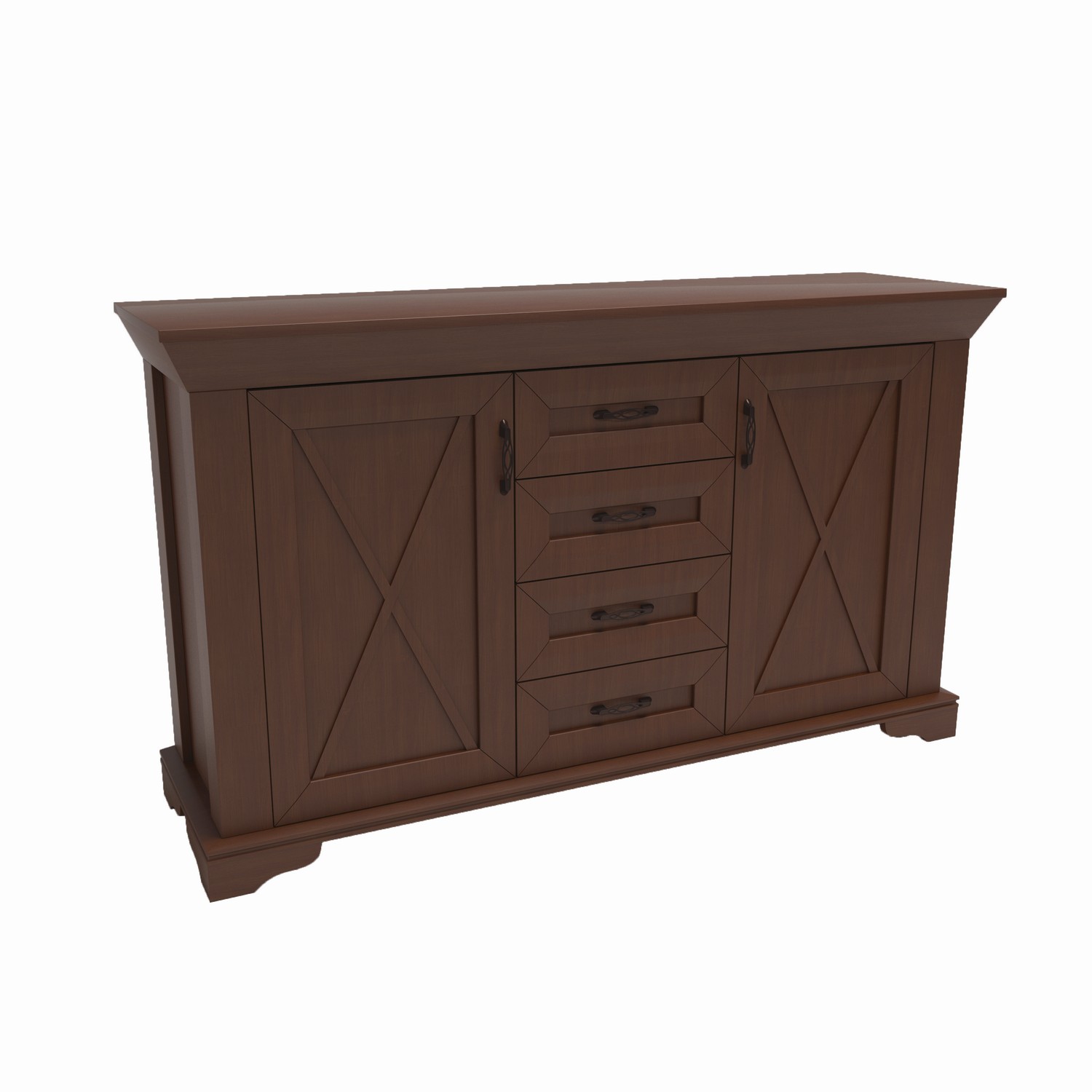 Elegantna komoda iz Serije X u toploj orah boji savršeno kombinuje klasičan dizajn i funkcionalnost. Karakterišu je tri vrata sa dekorativnim X detaljima i četiri centralne fioke, što obezbeđuje obilje prostora za uredno odlaganje.