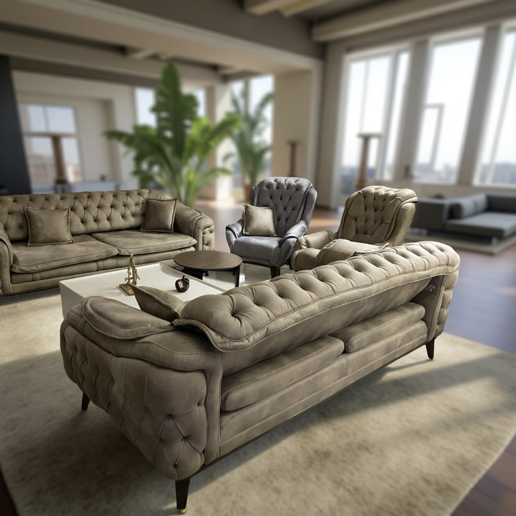 Garnitura Premium TTF je veoma moderna, poseduje futuristicki i elegantan dizajn. Ova garnitura će transformisati vaš prostor da odiše elegancijom, a u isto vreme prati moderne linije u dizajnu. Ova garnitura se sastoji od dva troseda i fotelje.