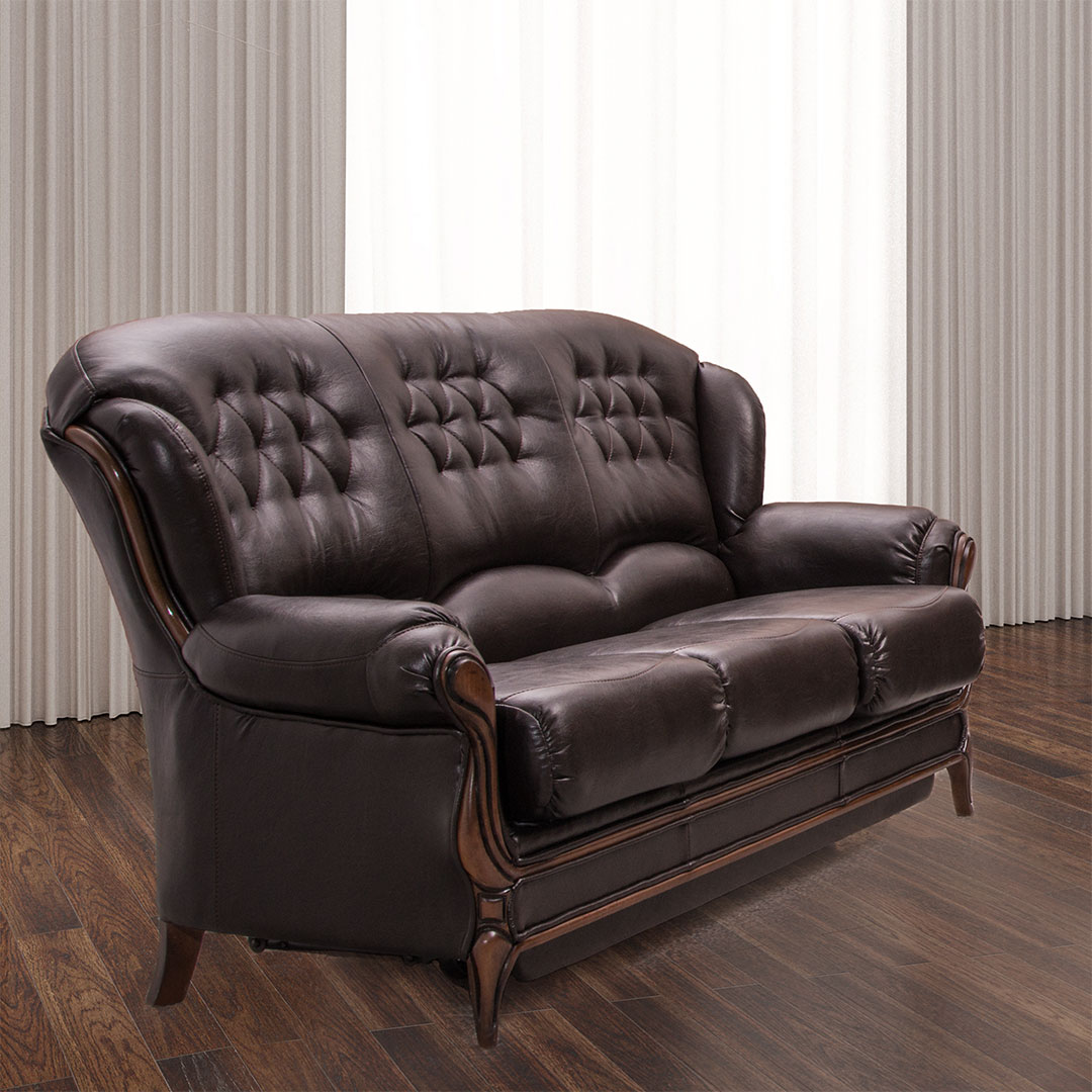 Klasican model troseda sa duborezima i veoma elegantnom linijom , manjih dimenzija adekvatan je i za manje prostore . Iako manjih dimenzija zbog svog dizajna i drvenih aplikacija , ovaj model troseda unsi u Vaš prostor snagu i stil. Trosed ima latofleks mehanizam za razvlačenje , sedišta su od sunđera gustine 28kg/m3 , a konstrukcija je od drveta . Izrađen u pravoj koži prve kalse kvaliteta Vaš će prostor učiniti otmenim i prijatnim .