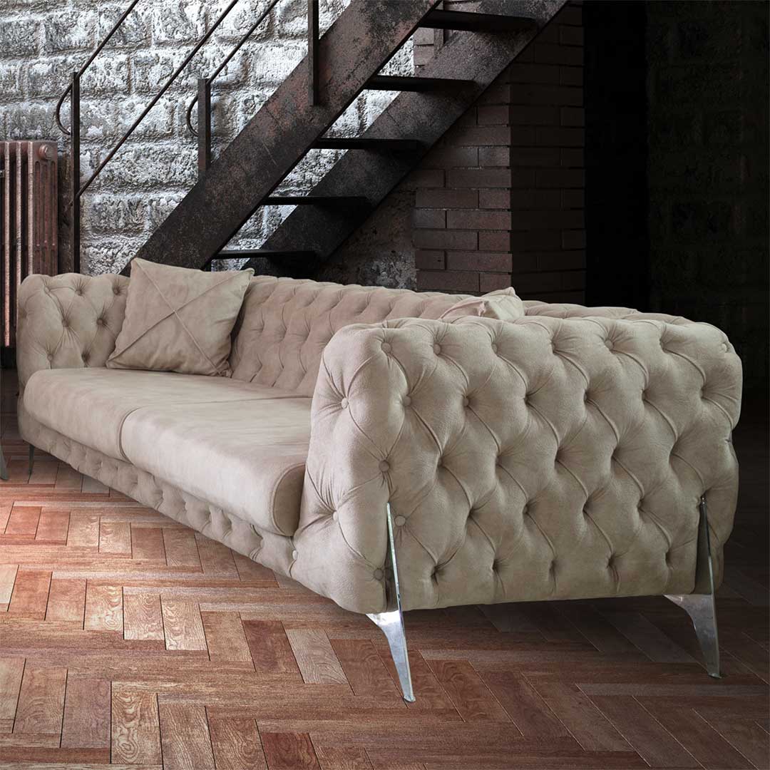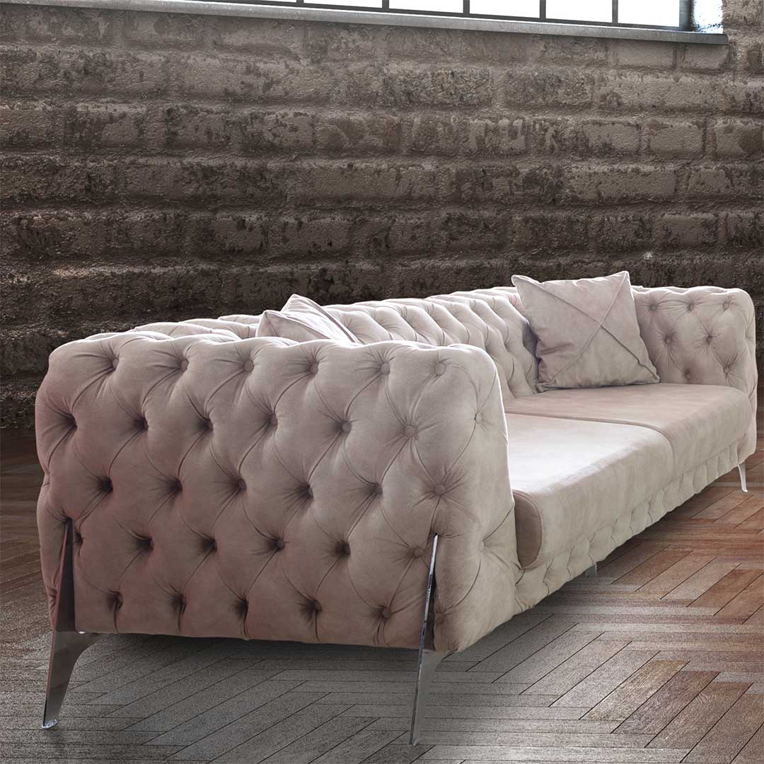 Trosed King odiše elegancijom , kako zbog svoje linije , tako i zbog inox noga koje su apsolutni hit na tržištu nameštaja . Savršeno se uklapa u moderno dizajnirane dnevne sobe .Sedišta troseda su od sunđera gustine 28kg/m3 , a konstrukcija je od drveta. Trosed nema opciju latofleks mehanizma za razvlačenje.