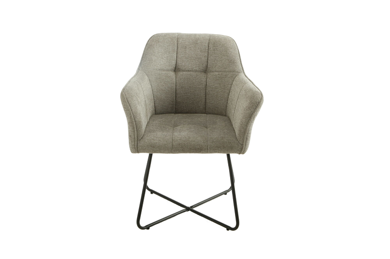 Moderna trpezarijska stolica tapacirana mekom tkaninom sa visokim naslonima za ruke. Sedište i naslon su napravljeni od šperploče, podstavljeni sunđerom i obloženi tkaninom koja je prošivena na leđima, sa naglašenim šavovima na sedištu i naslonima za ruke. Baza je izrađena od okruglih metalnih cevi, tretiranih praškastim premazom u crnoj mat boji. Dimenzija okruglih cevnih nogu je 1,6cm x 3,2 cm.