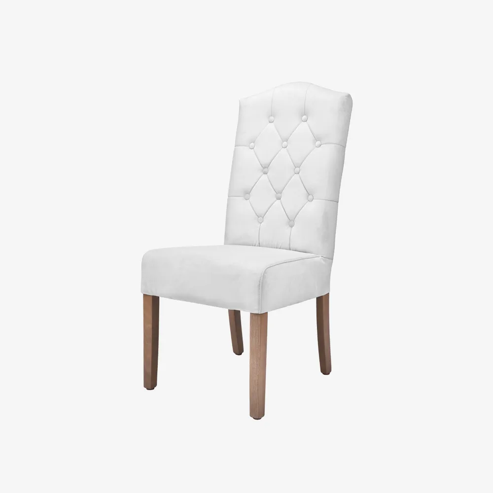 Tapacirana trpezarijska stolica elegantnog, klasično-luksuznog dizajna. Visok naslon je blago zaobljen na vrhu i bogato prošiven u kapitone (dugmad u dijamantskom rasporedu), što stolici daje barokni i sofisticiran izgled