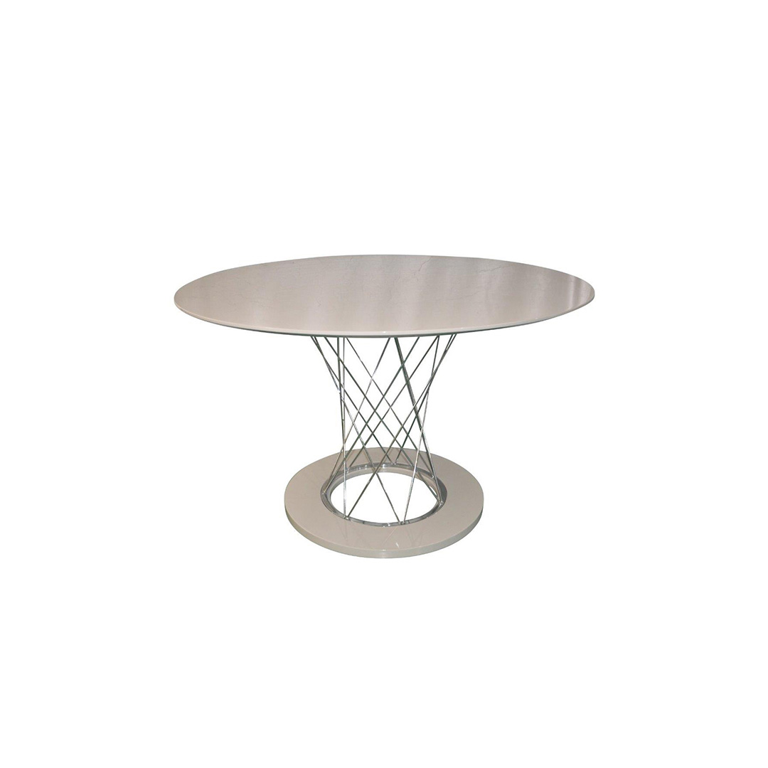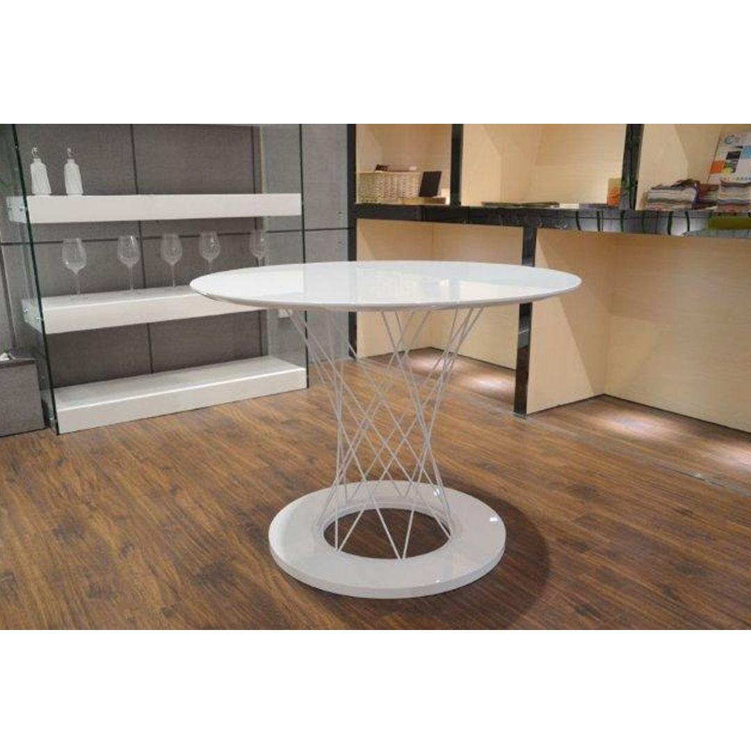 Trpezarijski sto modernog dizajna sa metalnom hromiranom nogom i pločom od farbanog medijapana u visokom sjaju u beloj ili Cappuccino boji.