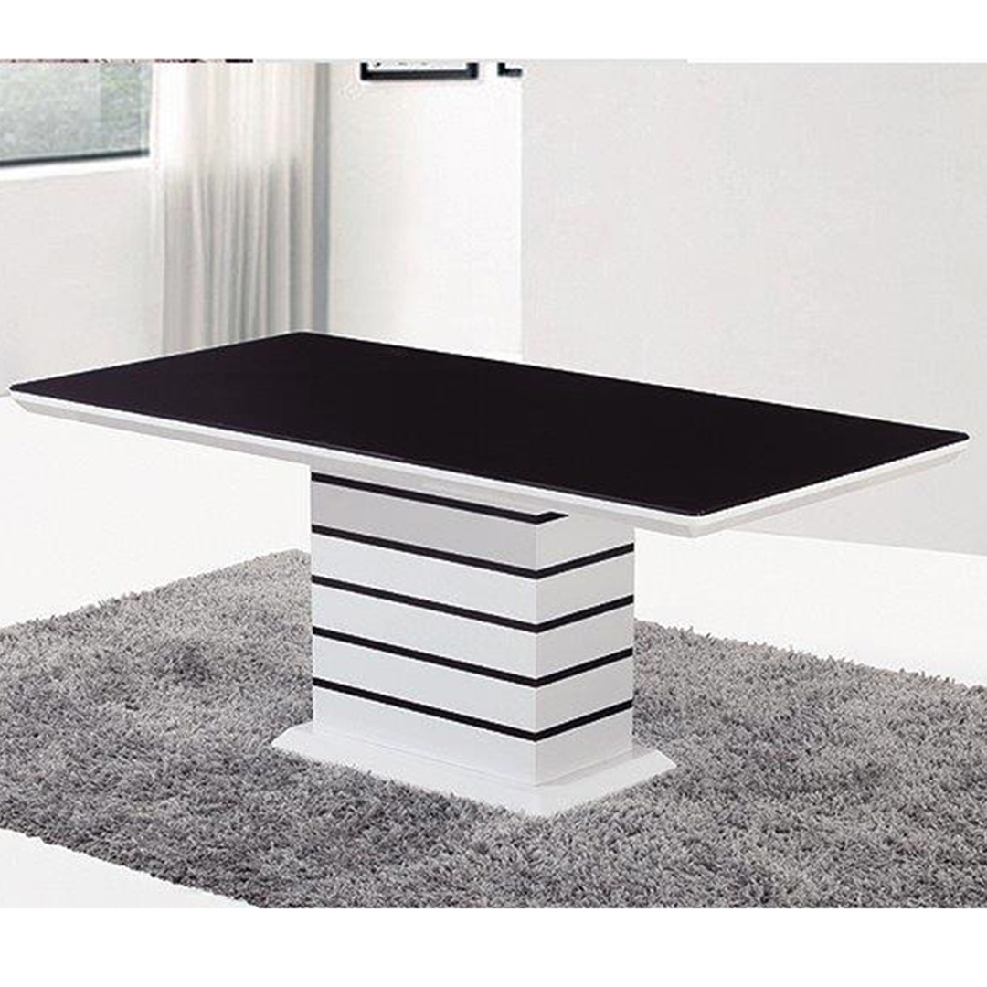 Trpezarijski sto od medijapana , sa pločom koja ima temporirano staklo . Postolje stola je takođe od medijapana u visokom sjaju.