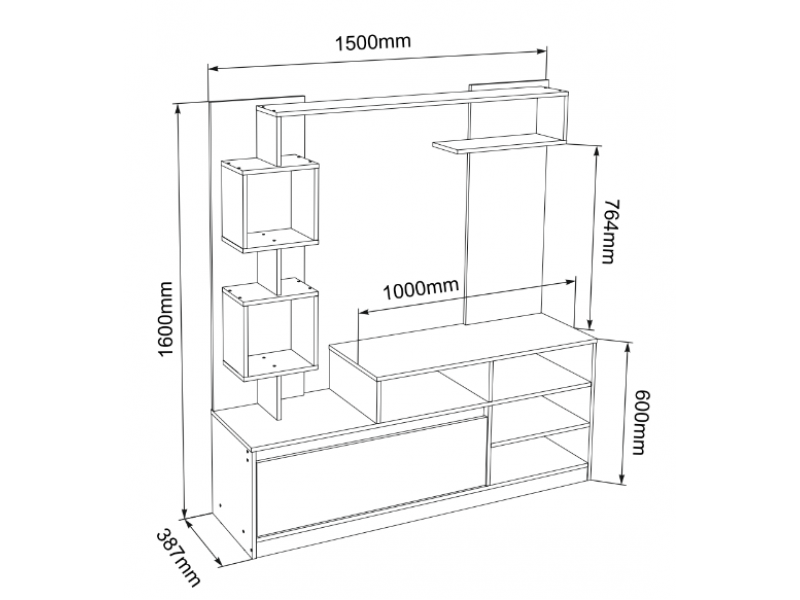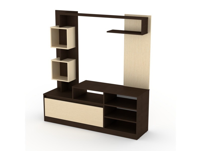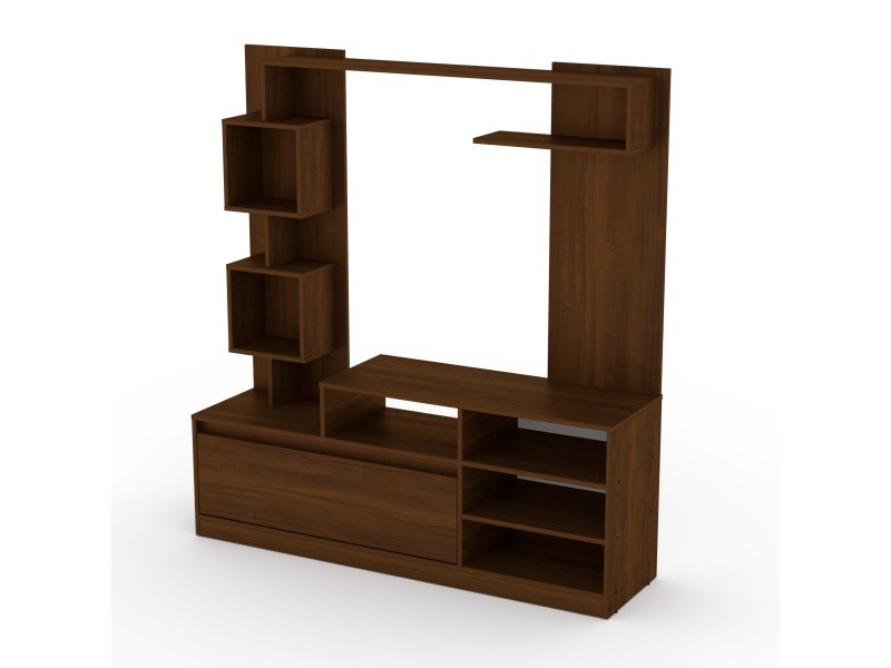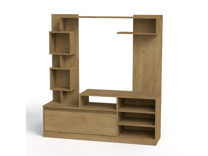 Raspored sekcije se oslanja na različite komponente nameštaja. Deo koji služi kao TV stalak ima otvorene police sa tri vertikalna i dve horizontalne kompartimente, što omogućava smeštaj televizora gotovo svih standardnih dimenzija. Na dnu se nalazi zatvoreni odeljak, koji zapravo predstavlja duboku fioku, idealnu za čuvanje raznih ličnih stvari koje želite da sakrijete. Iznad fioke su smeštene dve prozirne kutije, dok se na vrhu proteže polica koja zauzima celu širinu sekcije.