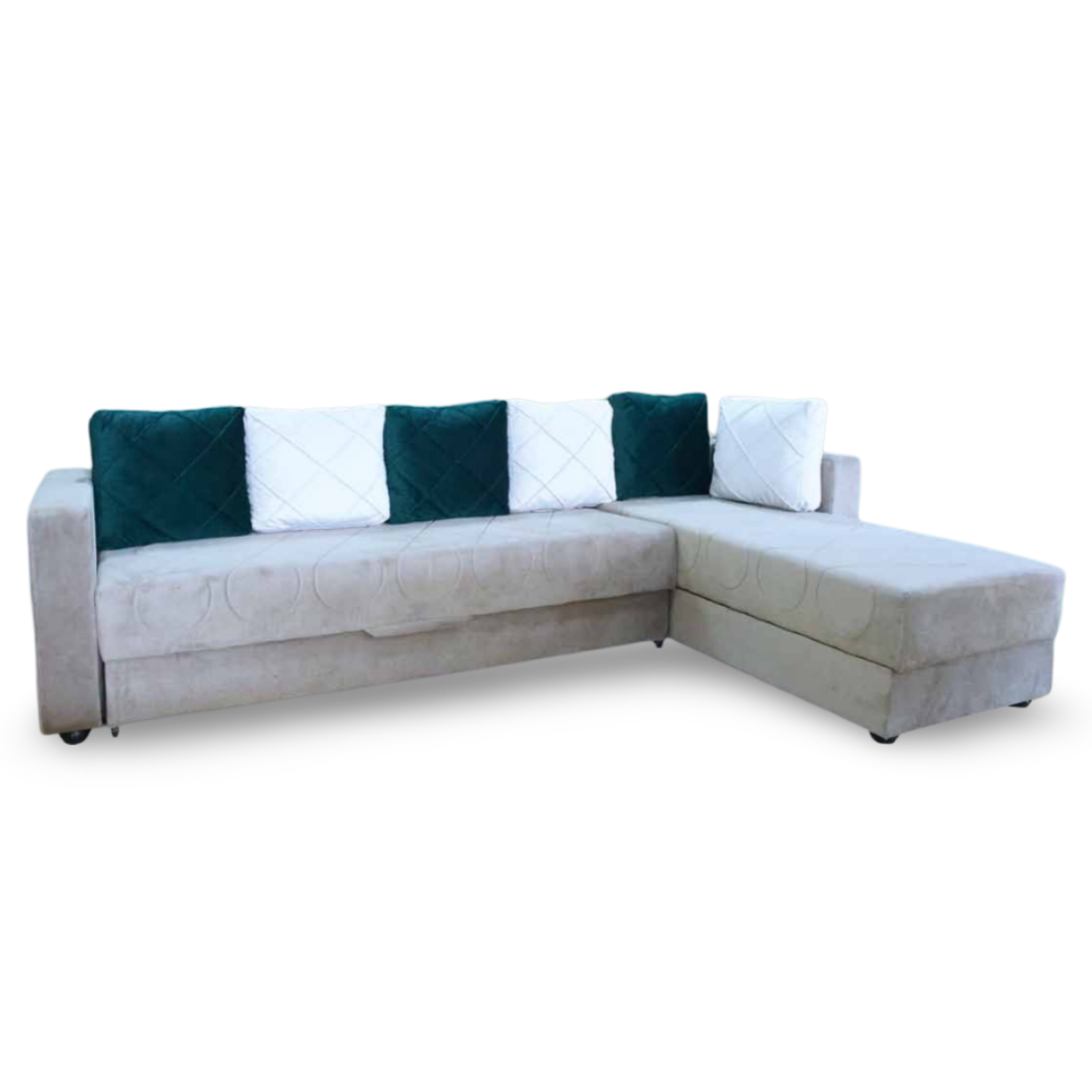 Ugaona garnitura veoma zanimljivog dizajna , sa žičanim jezgom , rasklapa se u ležaj , a ima i kutiju za odlaganje.Pored toga kupac ima mogućnost biranja između tabure koji je u kompletu sa garniturom ili za povećanje dimenzije garniture za dimenziju taburea. Izuzetno praktičan model . Konstrukcija garniture je od bukovog drveta . Ovaj model možete poručiti od platna ili u kombinaciji platna i eko-kože.