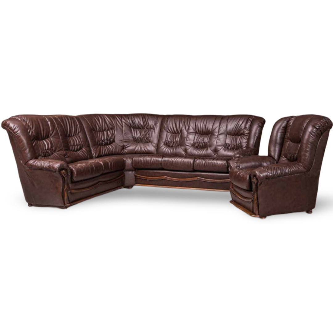 Ugaona garnitura Sofija TDF klasicnog dizajna , adekvatna kako za dnevni boravak , tako i za kancelarije . Elegenacija i snaga koje ovaj model garniture nosi učiniće Vaš prostor posebnim . Dekorativne drvene aplikacije mogu biti u različitim bojama , sedišta grniture su od sunđera gustine 28kg/m3 , dok je konstrukcija od bukovog drveta . Trosed ove ugaone garniture ima latofleks mehanizam za razvlačenje.Garnituru možete poručiti u koži iz ponuđene palete boja .