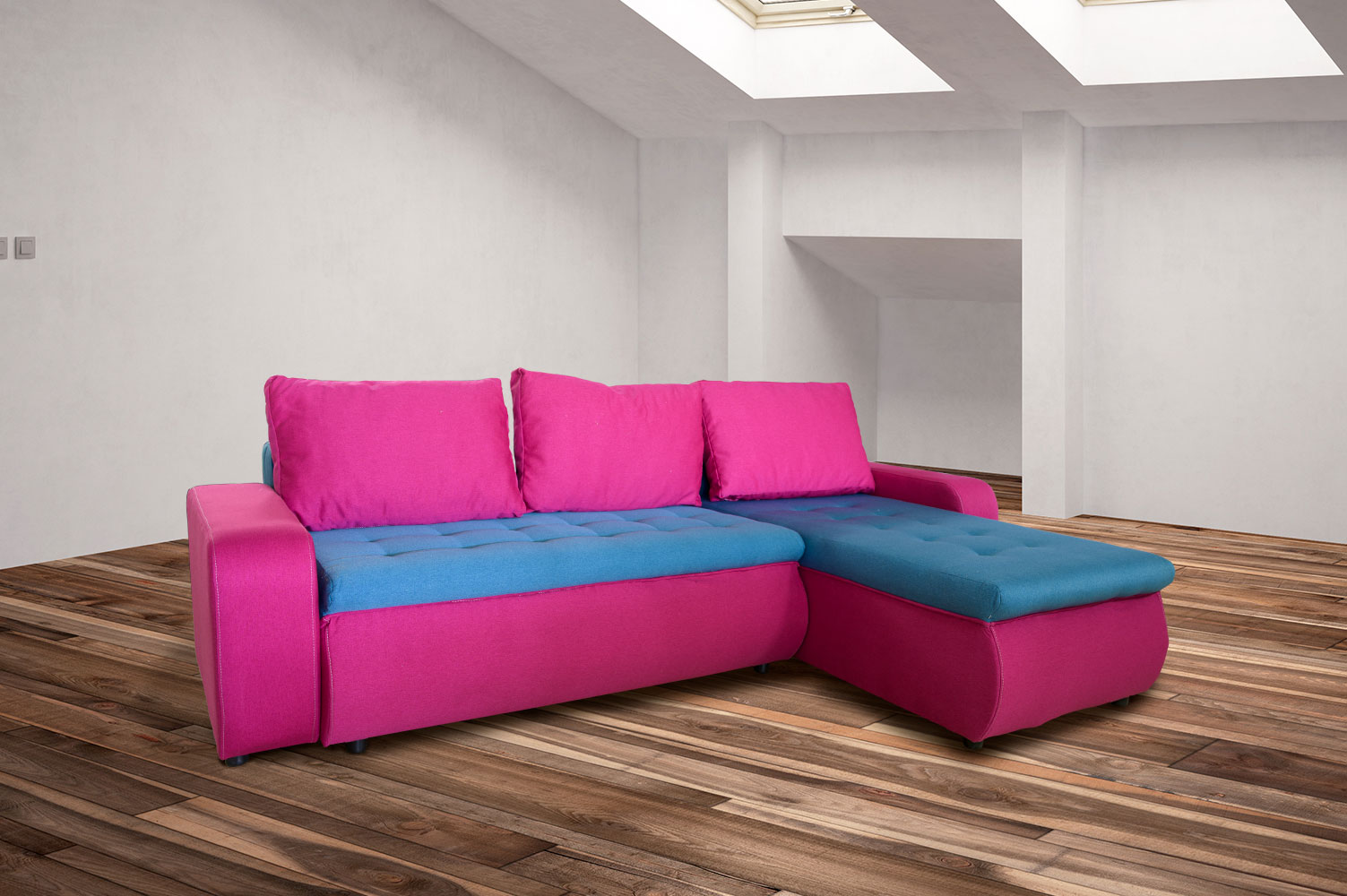 Garnitura svedenih linija , manjih gabarita , pogodna za manje prostore . Pored toga , garnitura Viva se razvlači , pa je idealno rešenje kada Vam je potreban alternativni prostor da neko prespava. Konstrukcija je od iverice , a sedišta od sunđera gustine 28kg/m3 . Ugaona garnitura Viva može biti izrađena od platna , eko-kože ili kombinacije ova dva materijala.