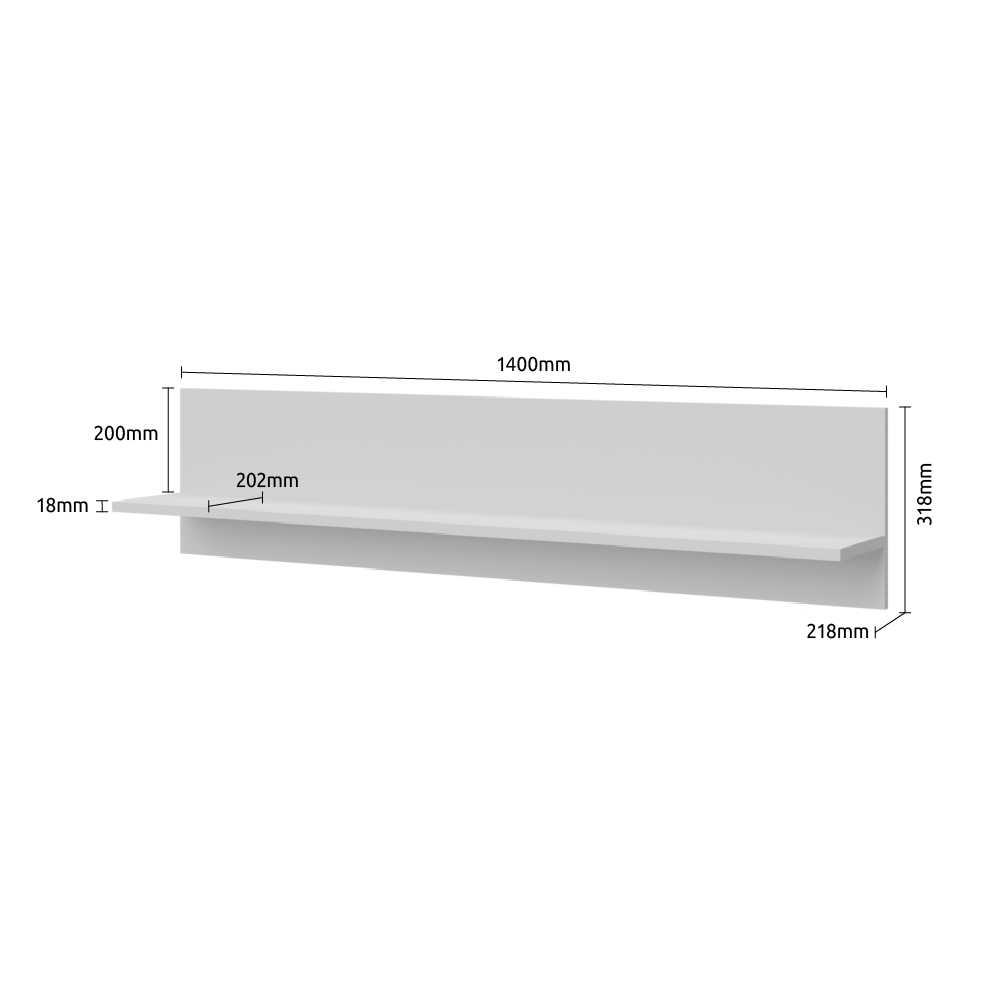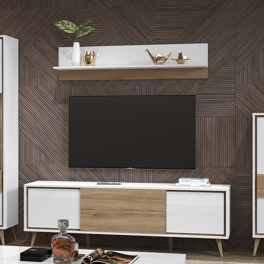 Viseća polica za dnevnu sobu, iz kolekcije VIDA, lakirana UV lakom u kristalno beloj boji, sa aplikacijom u drvo-dekoru Pacifik orah u visokom sjaju. Ovaj komad nameštaja namenjen je ljubiteljima retro dizajna.