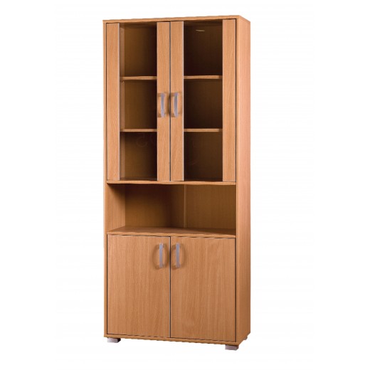 Gornji deo vitrine sadrži dvoja vrata sa staklenim panelima i unutrašnje police, idealne za čaše, posuđe, knjige ili dekorativne predmete. U sredini se nalazi otvorena polica koja omogućava brz pristup često korišćenim stvarima ili dekoraciji. Donji deo je opremljen sa dvoja puna vrata, iza kojih se nalazi dodatni prostor za odlaganje.