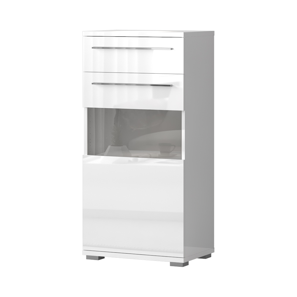 • Funkcionalna vitrina iz kolekcije nameštaja PIANO sa jednim staklenim krilom I jednom fiokom, dizajnirane geometrijske forme.