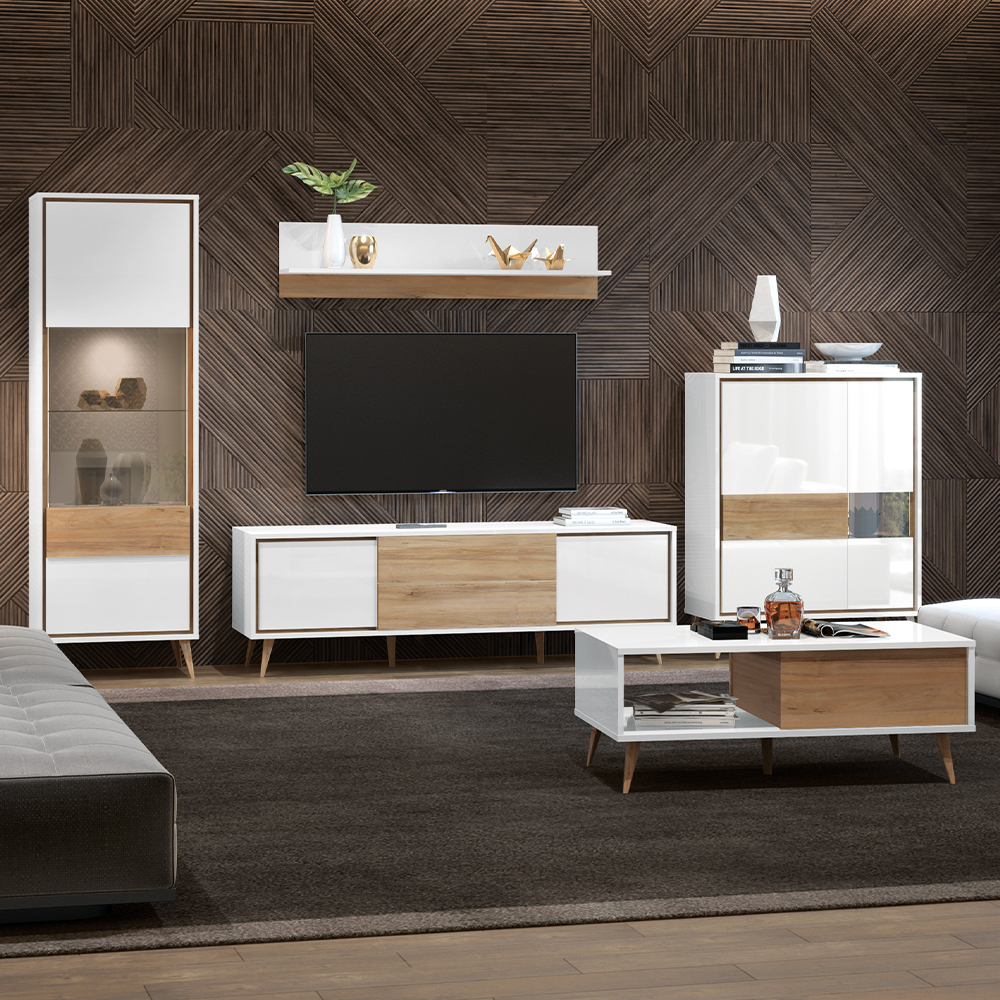 • front vitrine lakiran je UV lakom u visokom sjaju u kristalno beloj boji sa aplikacijom u drvo-dekoru Pacifik orah